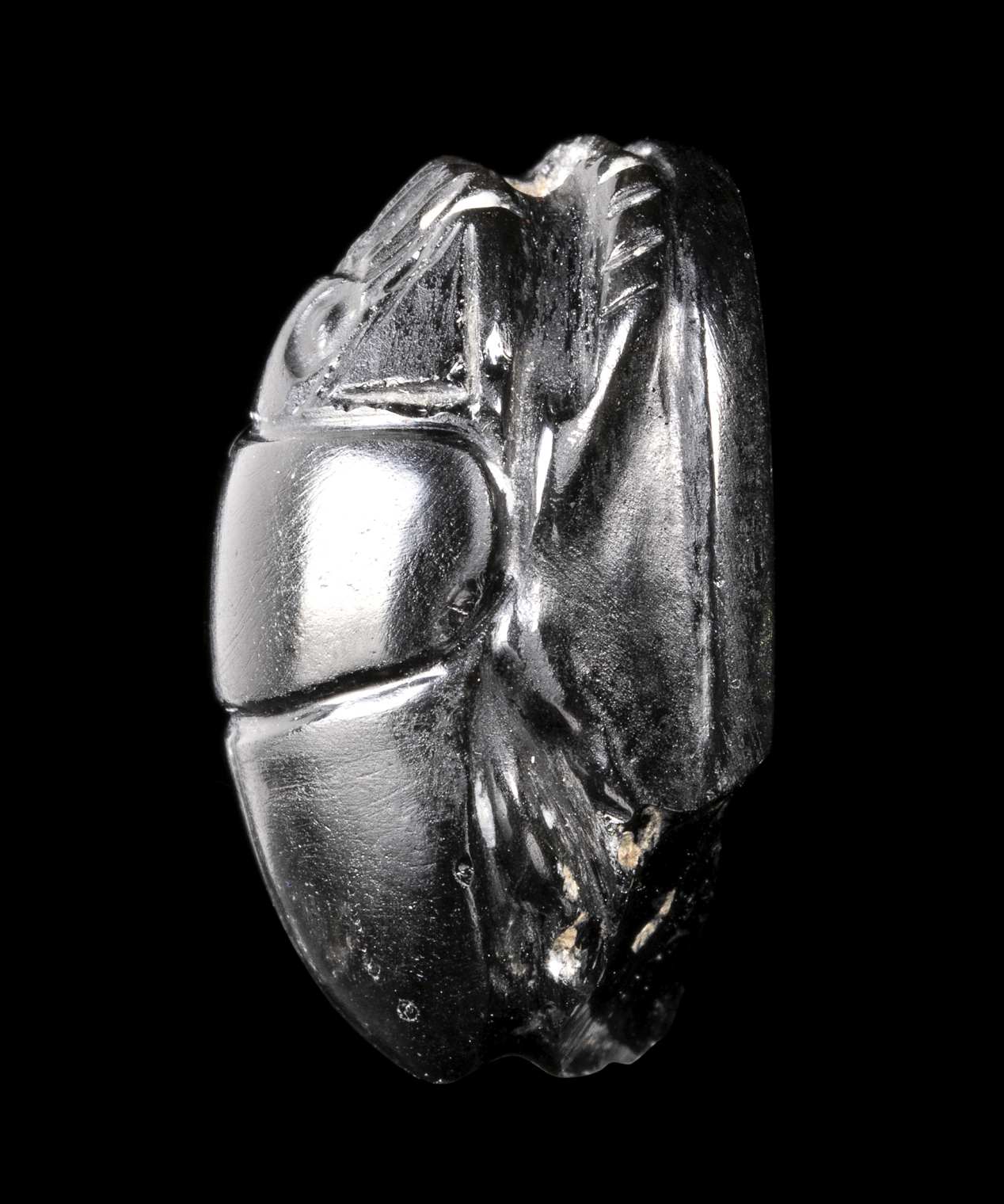 The back engraved in a stylized manner for the anatomical details. The reverse shows Bes encrowned standing front, holding ibex on each hand (as Master of the Animals),on top the winged solar disc. Under his feet, crocodiles (partially missing). The stone is damaged with a missing part. Wear marks. Rare.