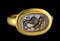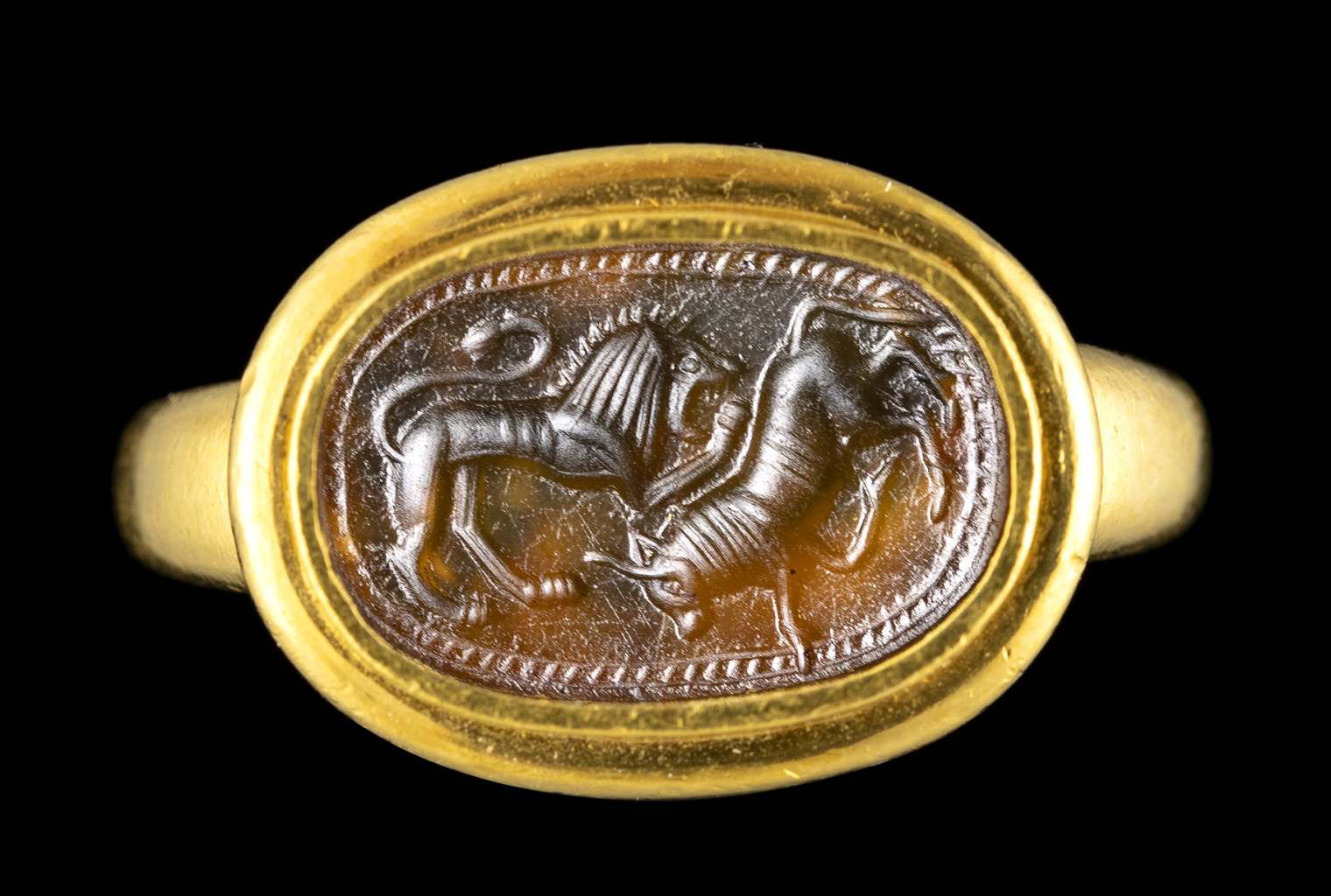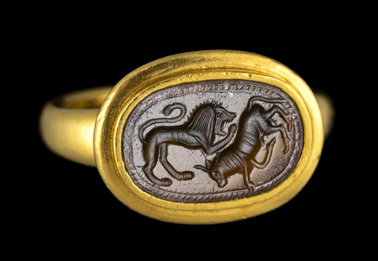 A RARE PHOENICIAN DARK CARNELIAN INTAGLIO SET IN A MODERN GOLD RING. LION ATTACKING A BULL.