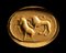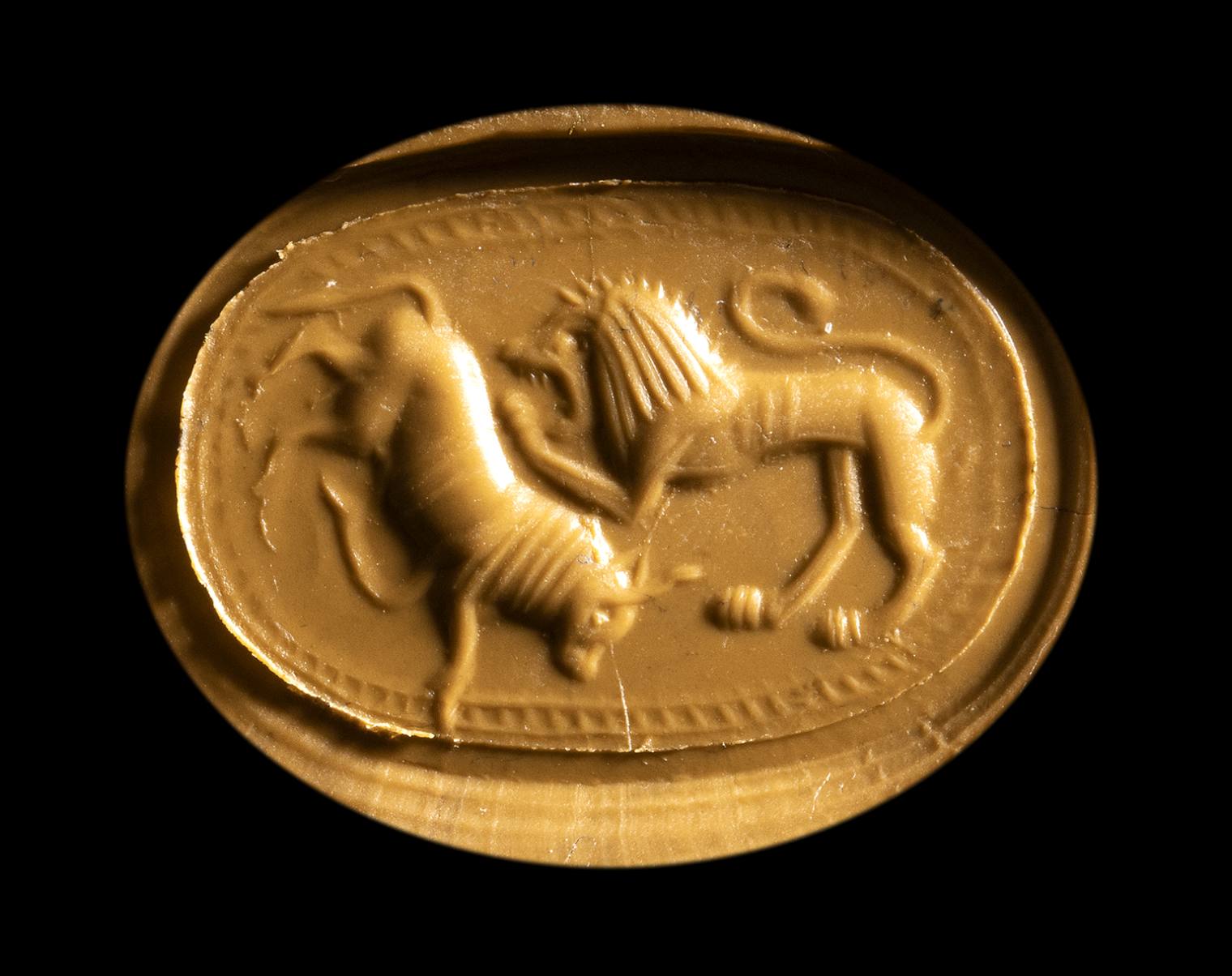 The lion, on the left, attacks the bull on the right of the scene, according to a stylized composition referable to the Phoenician production of the Classical Era. This production is inspired by archaic Greek models. Hatched border. Slight crack in the center of the stone, set in a heavy modern gold ring. This long popular oriental motif is well represented in a series of gems like this one. The Greek adopted the subject for their archaic scarabs. They also had some Eastern art influence (Persian empire).