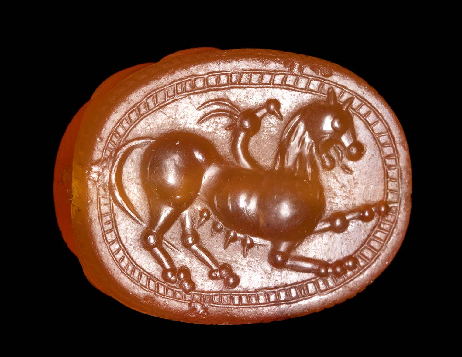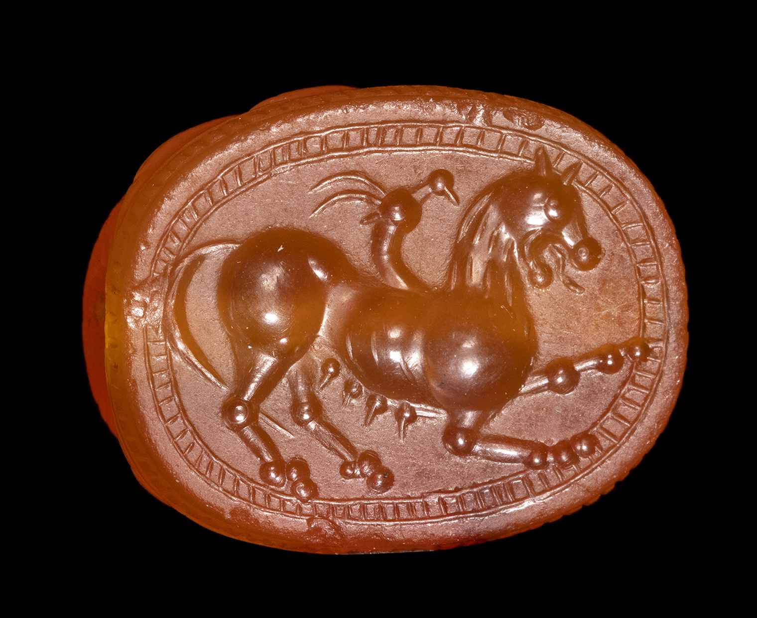 A LARGE ETRUSCAN CARNELIAN SCARAB. CHIMERA.