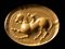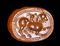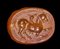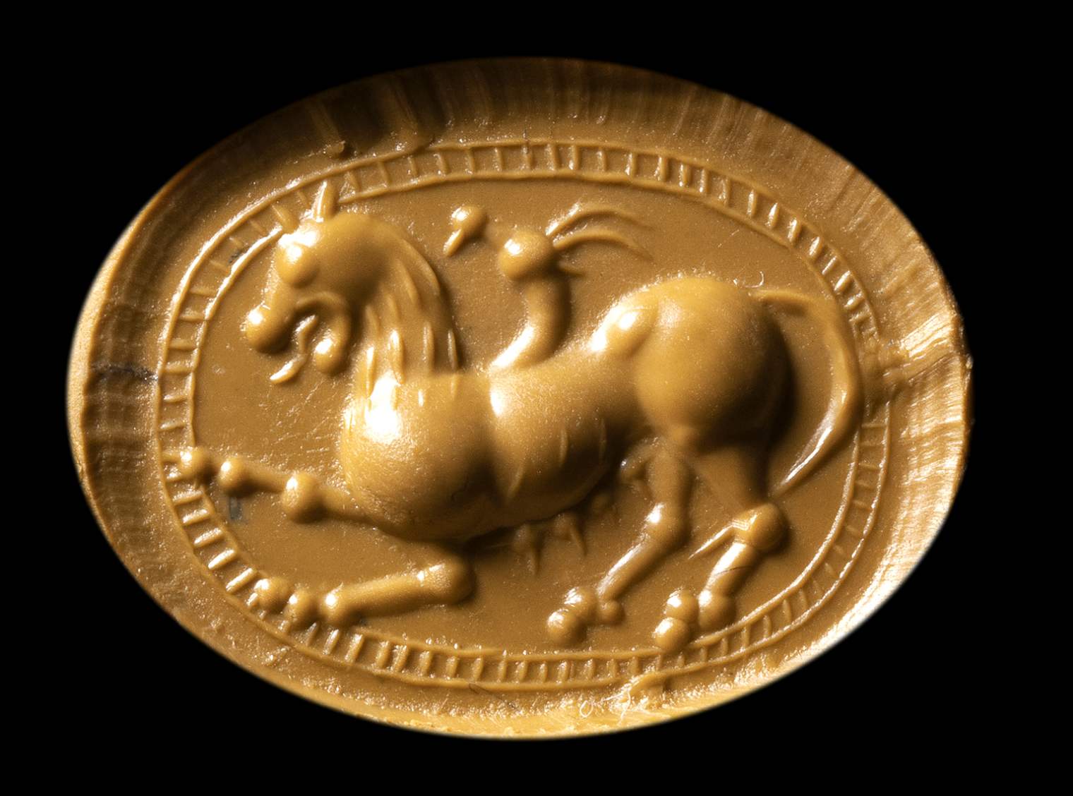 Beautiful and refined representation of the chimera facing right, with the open mouth and the tongue out. The fantastic creature is characterized by the body of a lioness, protome of a goat on the back, tail of a snake. Massive use of globular elements, Hatched frame. Slight wear marks. Small chips on the edge. Beautiful execution.