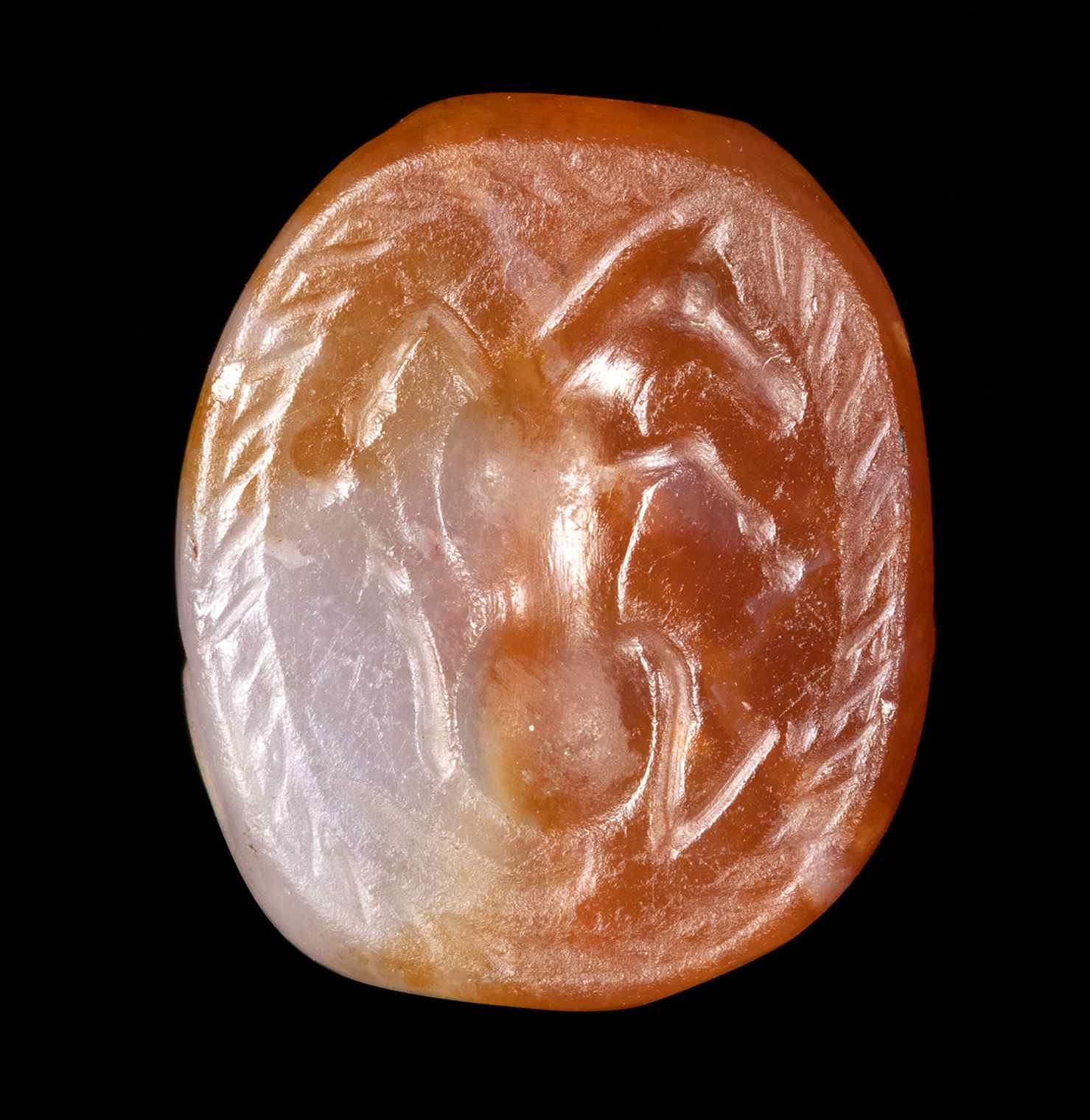 AN ETRUSCAN CARNELIAN SCARAB. A ROLLING HORSE.
