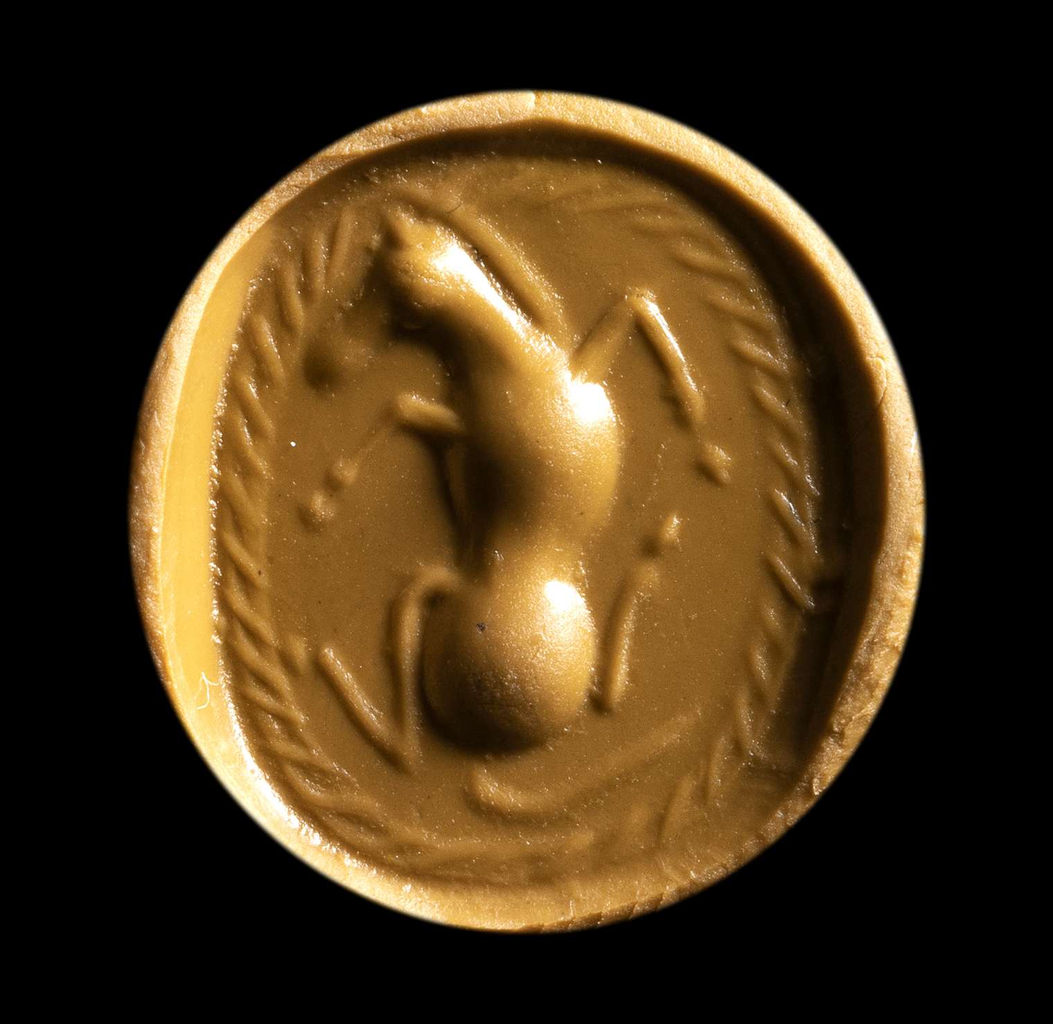 Horses, mules and donkeys rolling on the ground are not uncommon on Greek and Etruscan gems. As Furtwangler suggests, they may have had a connotation of good luck; or the subject appealed as lending itself to an interesting composition in the elongated field of the gems. In that stone, the body is seen from beneath, the head with the neck in profile turned to the right, the legs are open in different directions. Hatched border. Wear marks. As Boardman said, the subject is surprising. Fallen horses are seen on Archaic vases, but then generally as part of a chariot team that has come to grief. It appears as an isolated motif in major art a little later, however in Polygnotos'wall painting of the Sack of Troy in a building at Delphi: Pausanias describes "a horse who seems about to roll in the dust" .