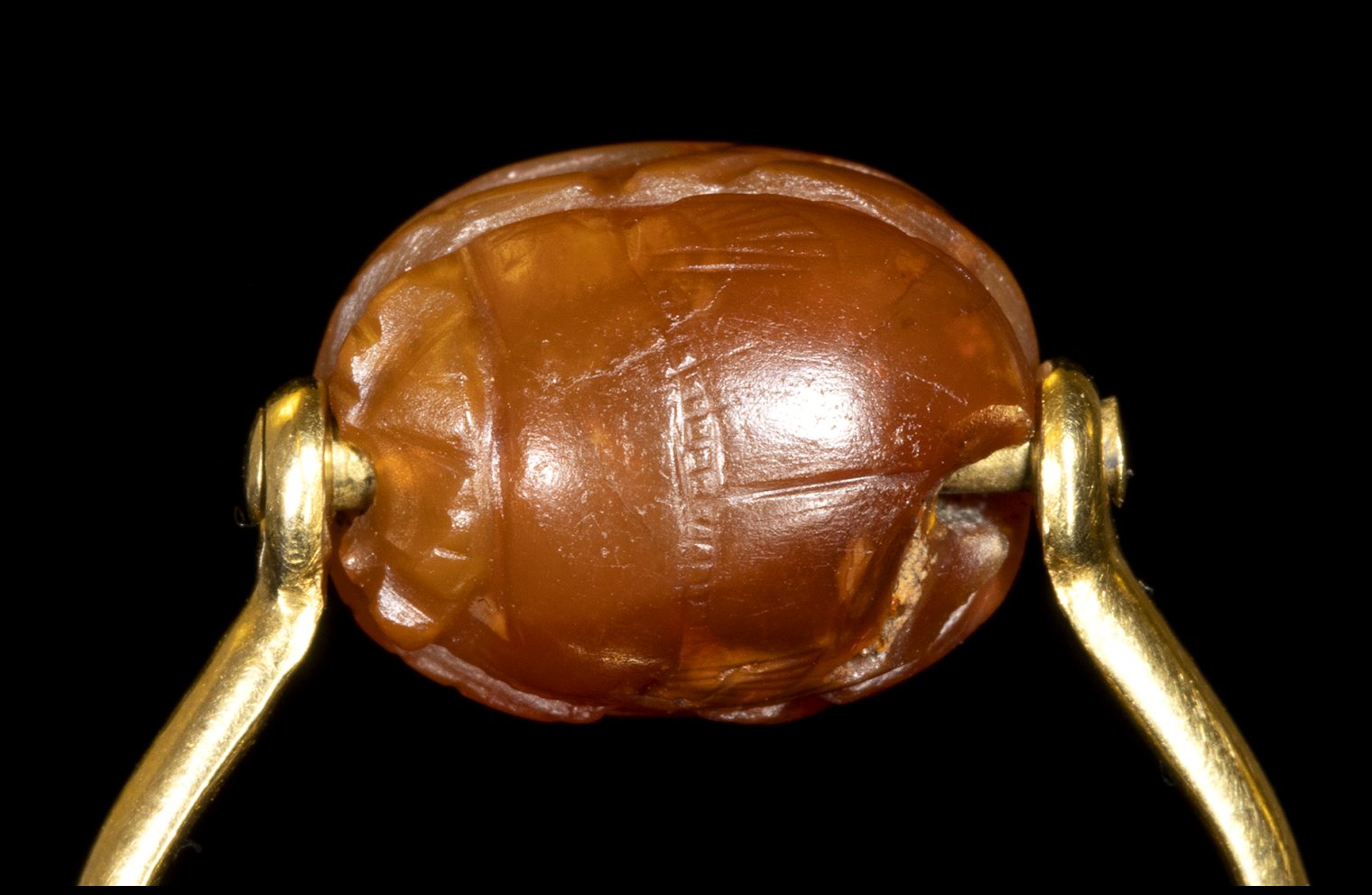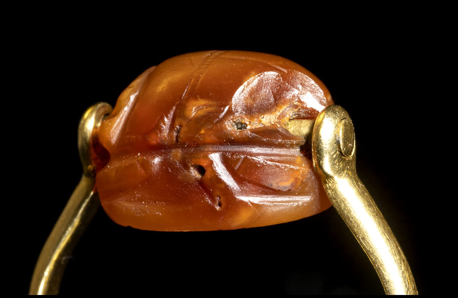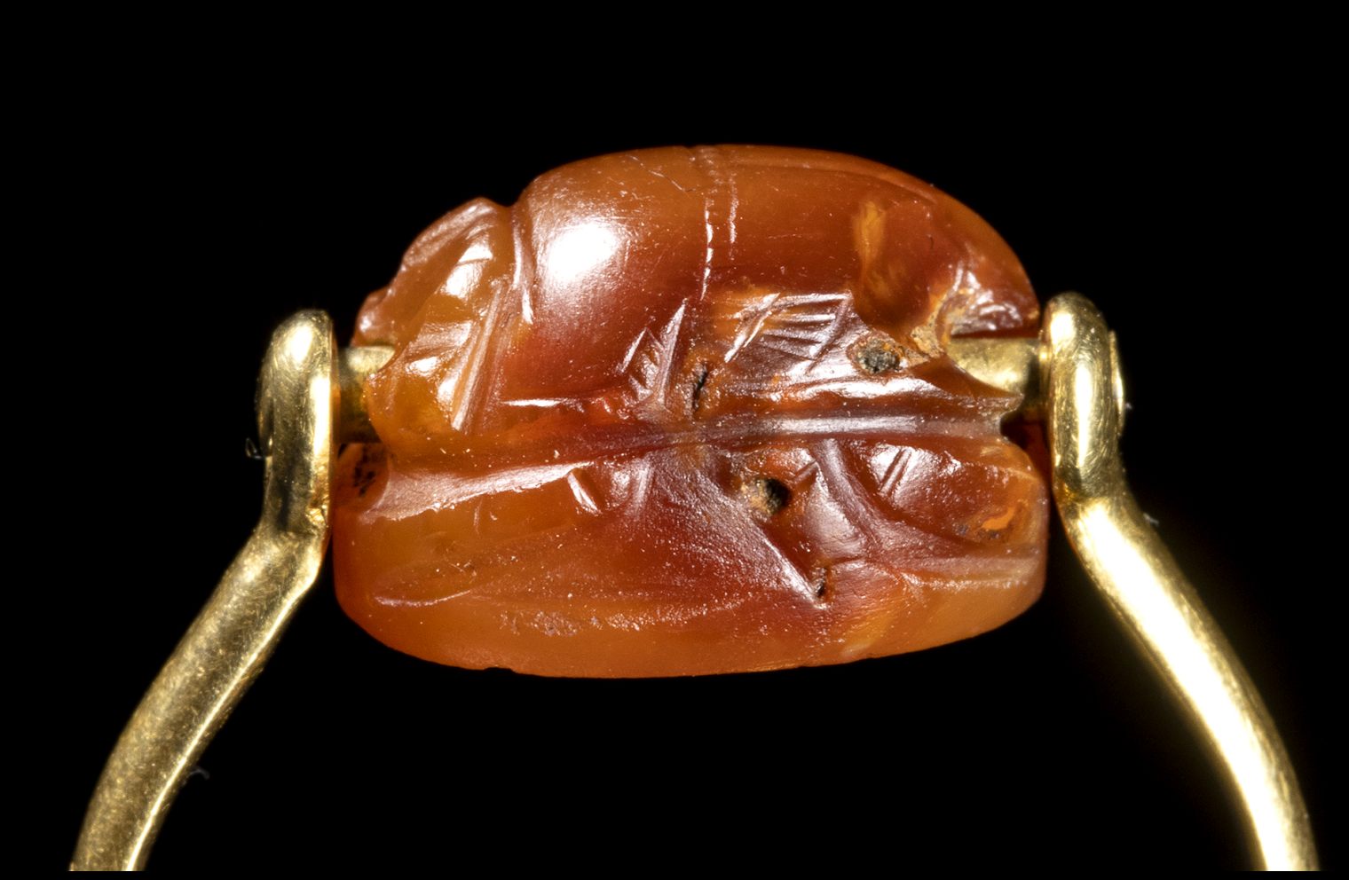AN ETRUSCAN CARNELIAN SCARAB INTAGLIO SET IN A GOLD SWIVEL RING. WINGED PHALLUS WITH A DOLPHIN.