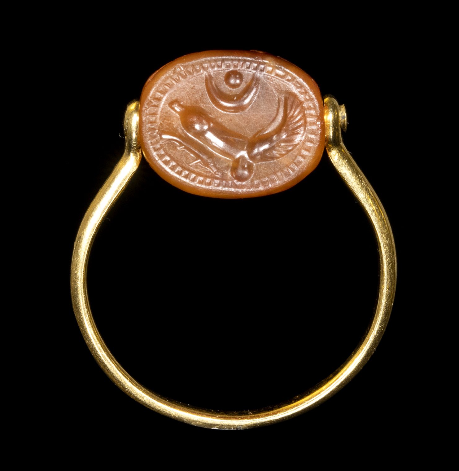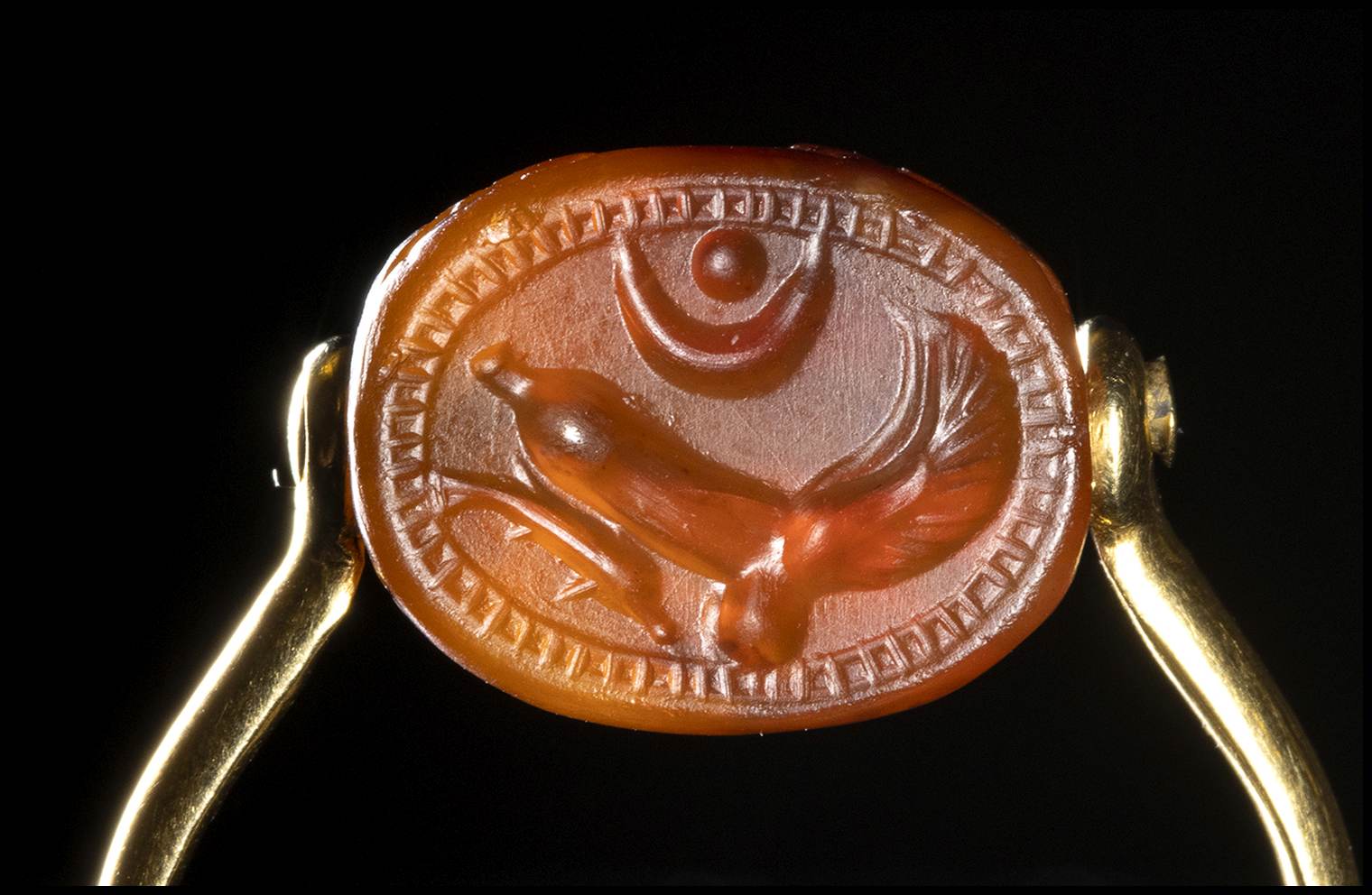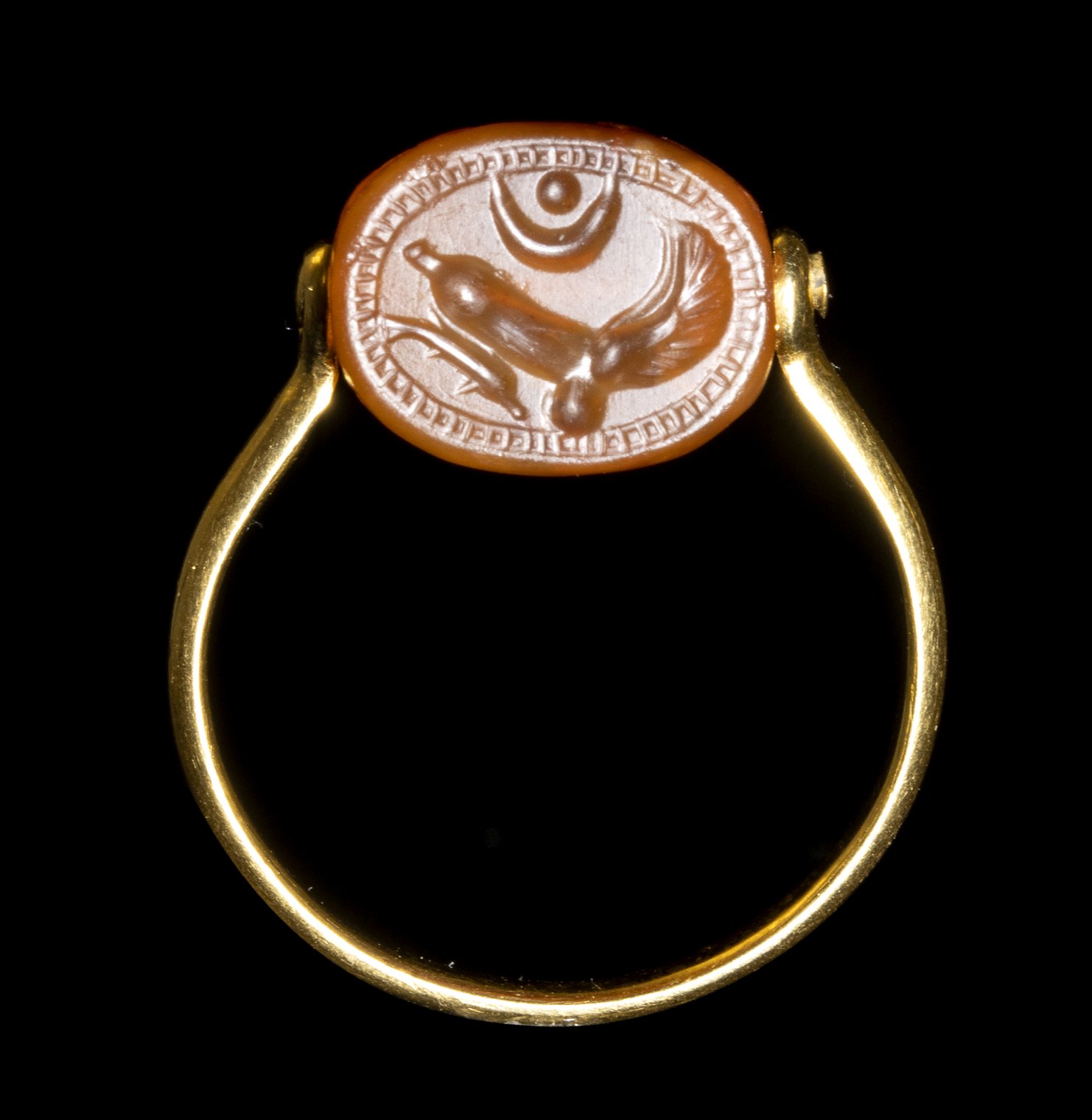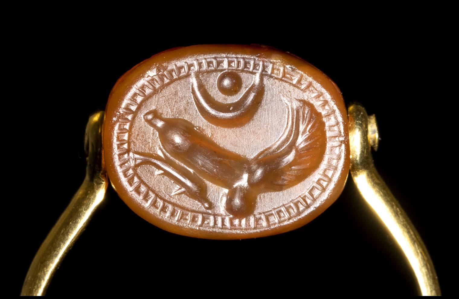 AN ETRUSCAN CARNELIAN SCARAB INTAGLIO SET IN A GOLD SWIVEL RING. WINGED PHALLUS WITH A DOLPHIN.