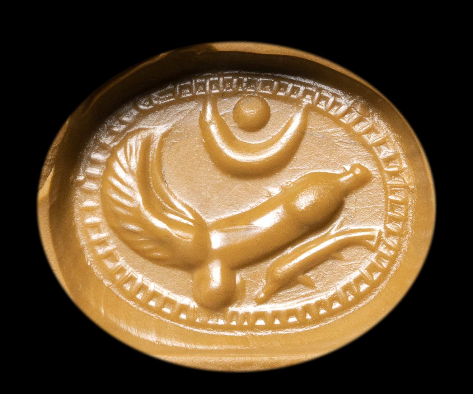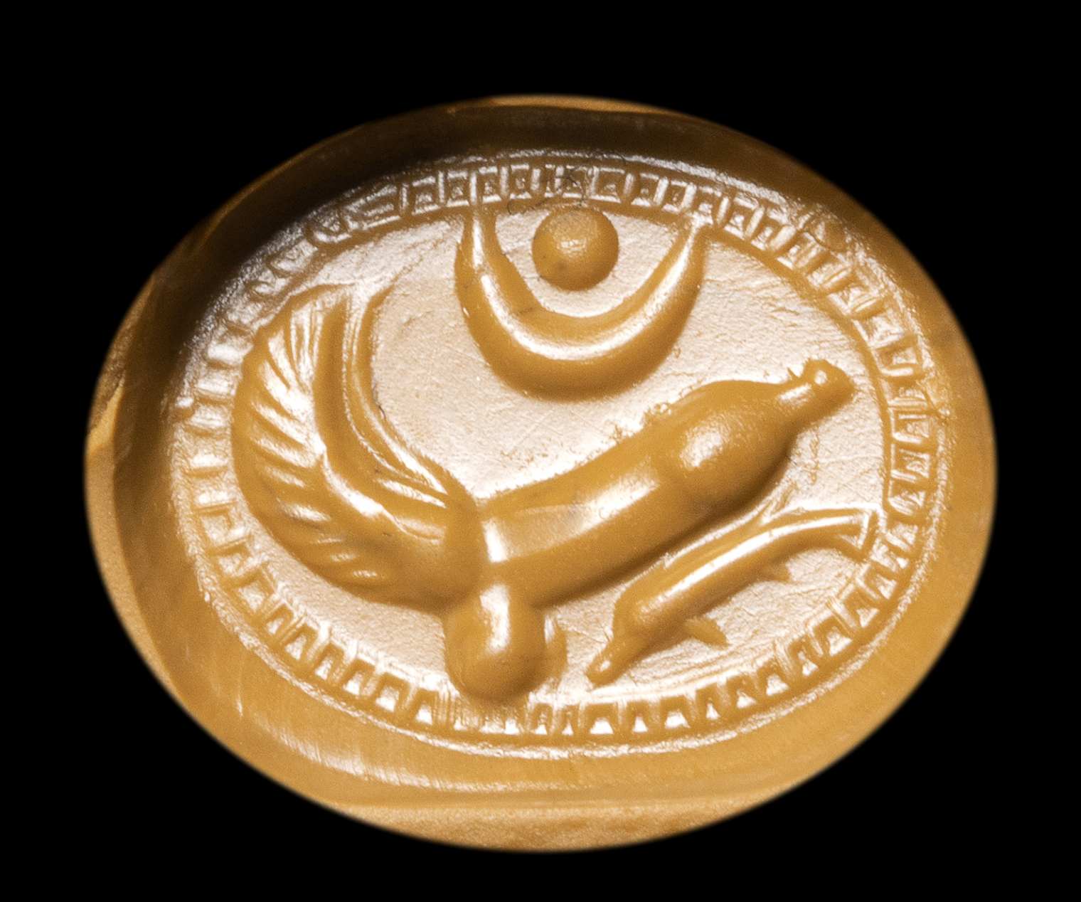 Winged phallus to the left. Below, a dolphin, to the right. Above, a crescent with a stylized star. Use of globular elements. Dotted frame. Wear marks. Interesting composition, apparently unique. Allegory of fertility under the good astral and marine auspices. Rare.