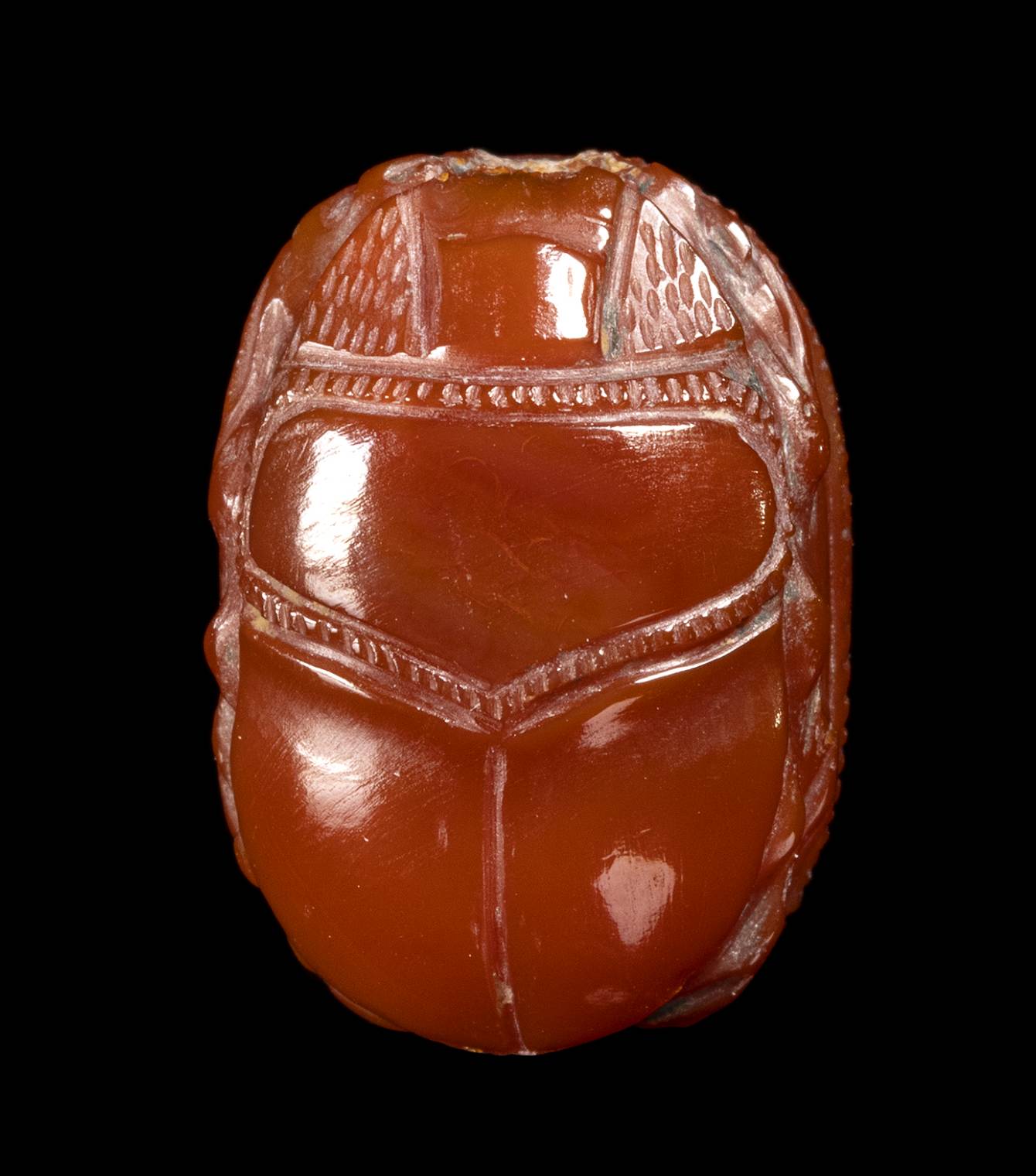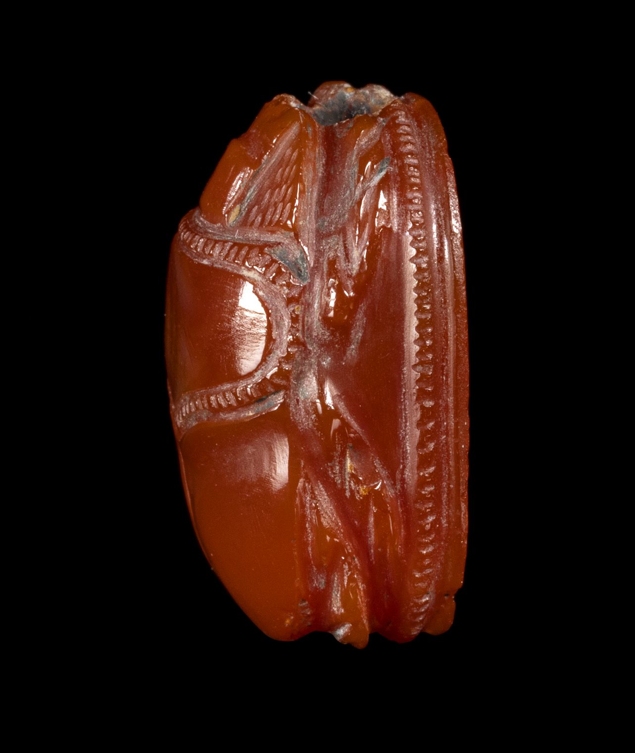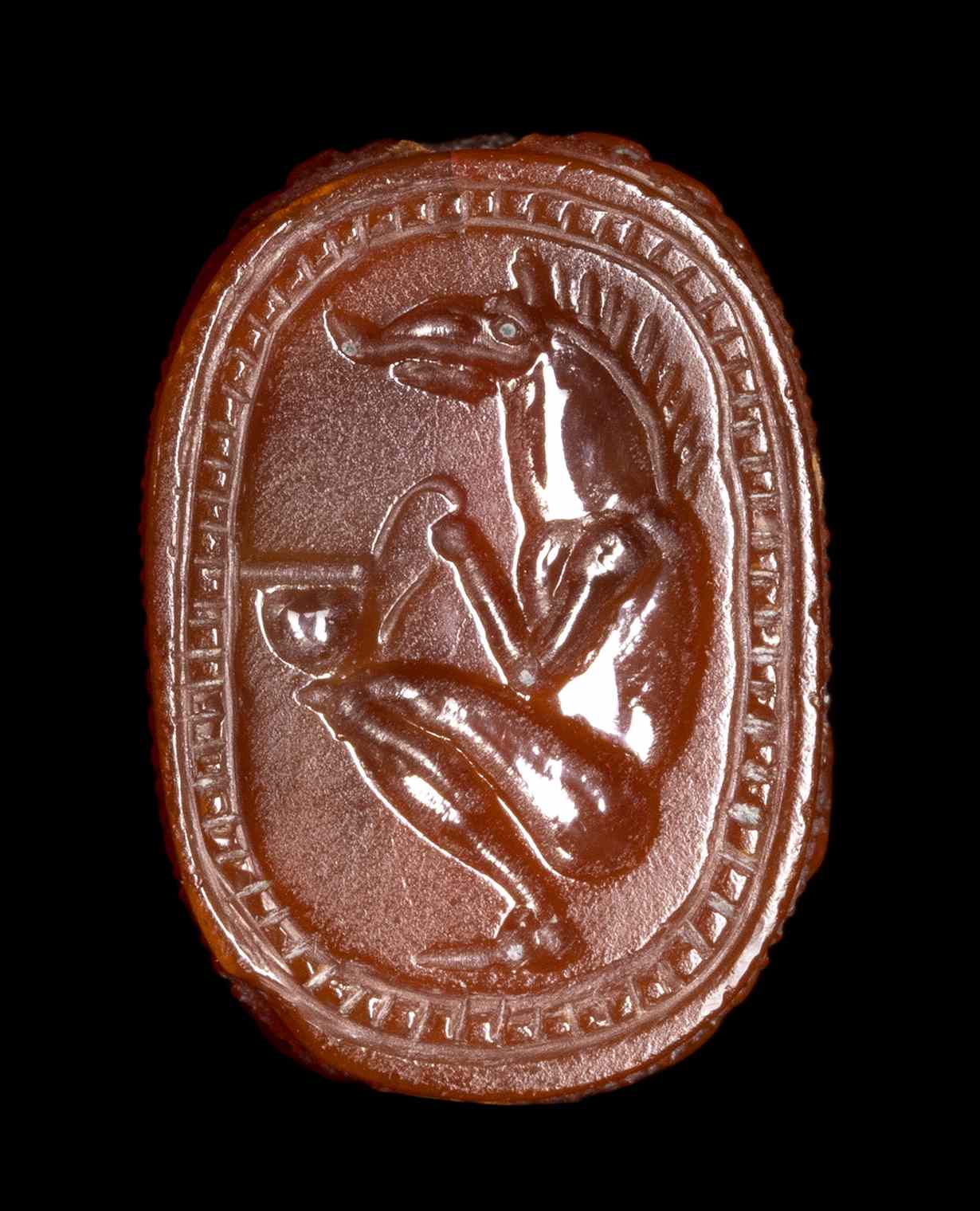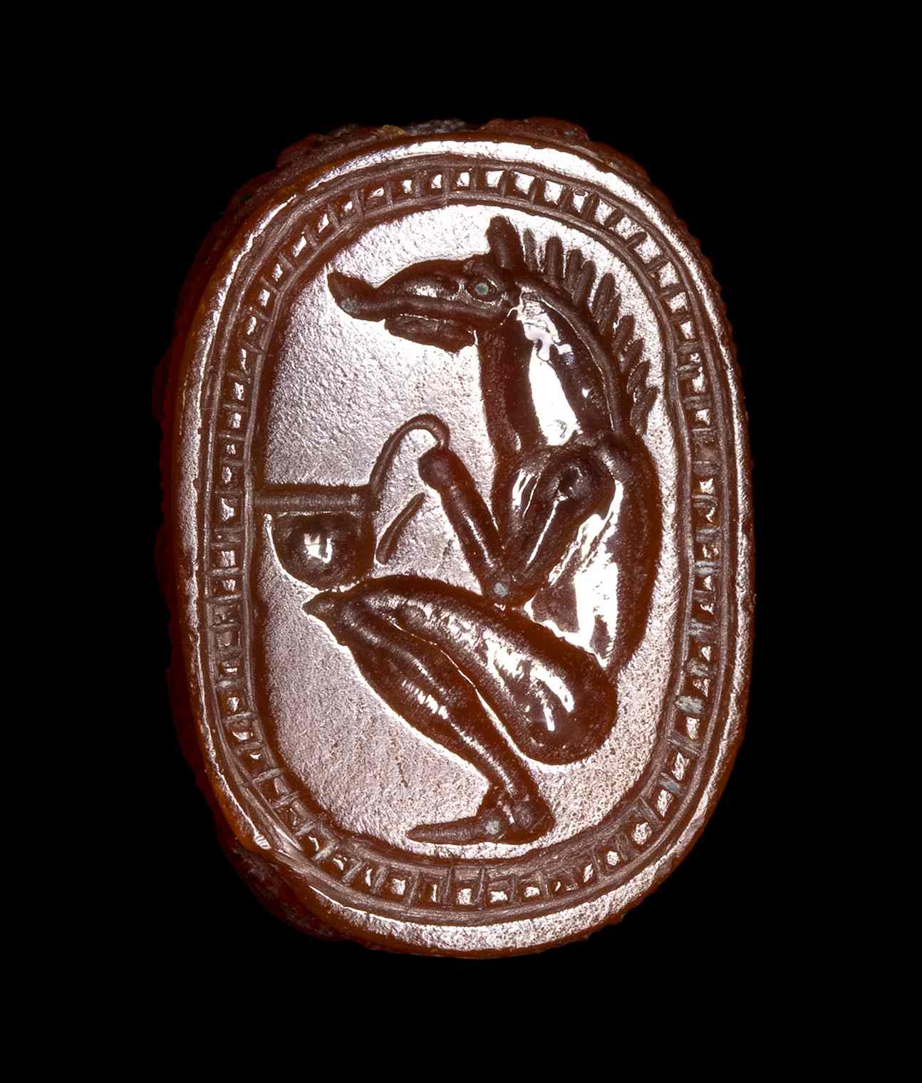 Lot 47 | AN ETRUSCAN CARNELIAN ENGRAVED SCARAB. SEATED HYBRID FIGURE WITH A WILD BOAR'S HEAD.