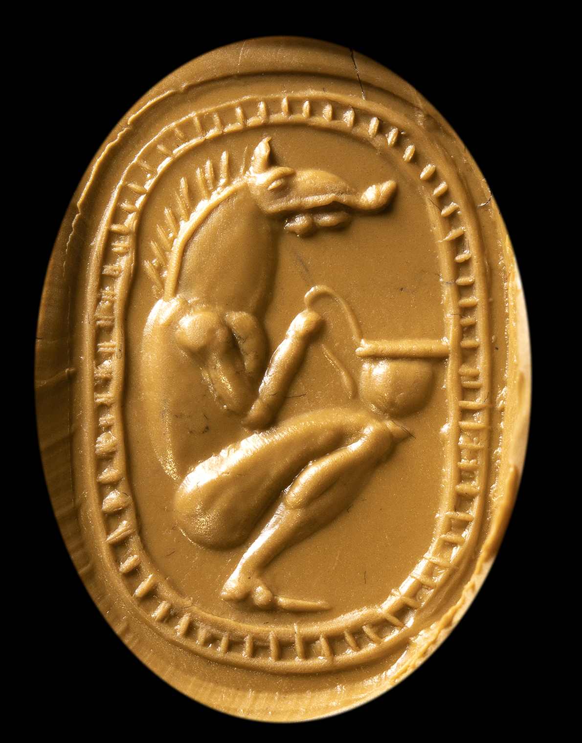 Hybrid figure sitting on his own legs composed of a human body and a boar's head. The creature is facing left and holds a kantharos. Use of globular elements. Dotted frame. Through hole. Slight wear marks. Interesting rare subject.