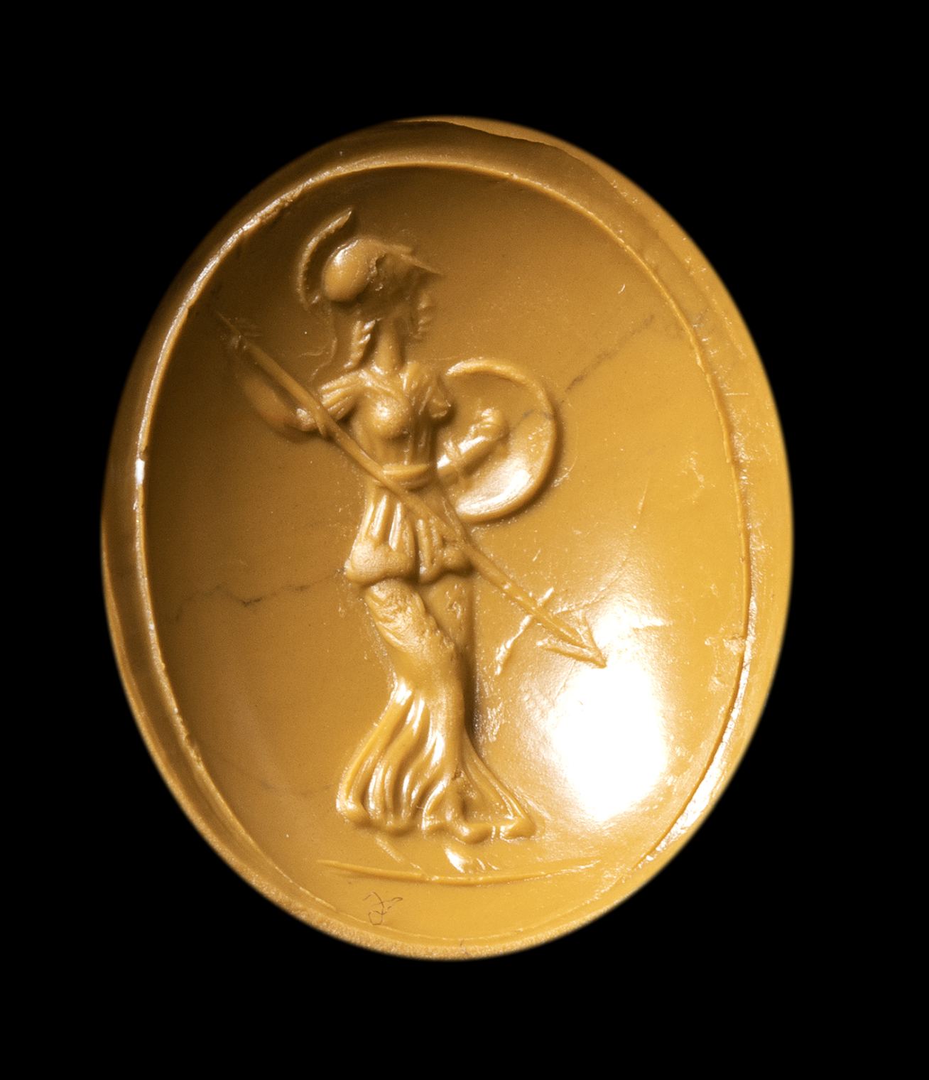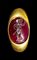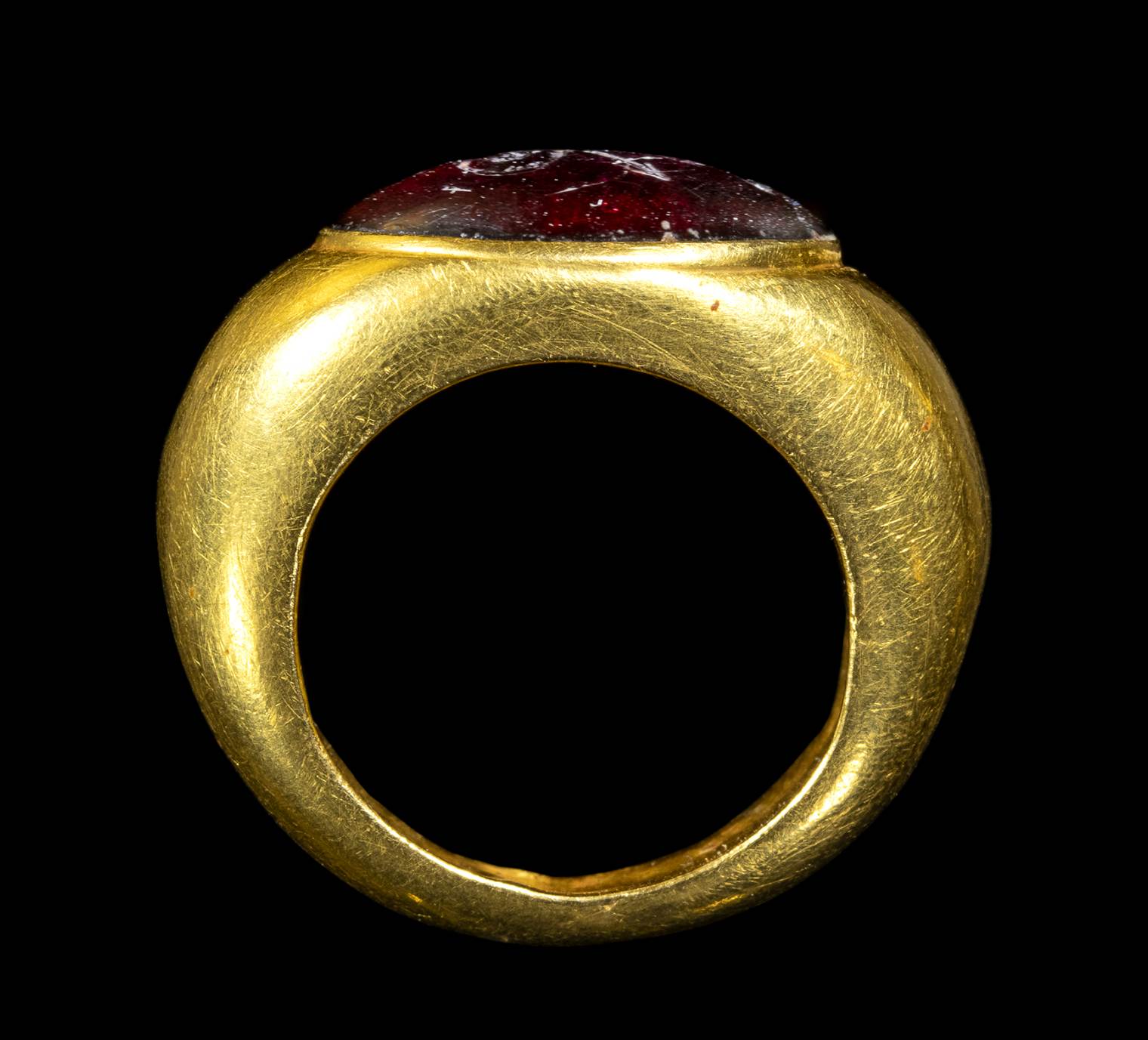 With rounded hoop, expanding in broader rounded shoulders and set with a fine cabochon garnet intaglio depicting the helmeted goddess advancing in three-quarters. She wears the chiton and himation, the spear in her left rised hand and the shield in the right one. Groundline. Beautiful colour of the stone, wear marks.