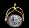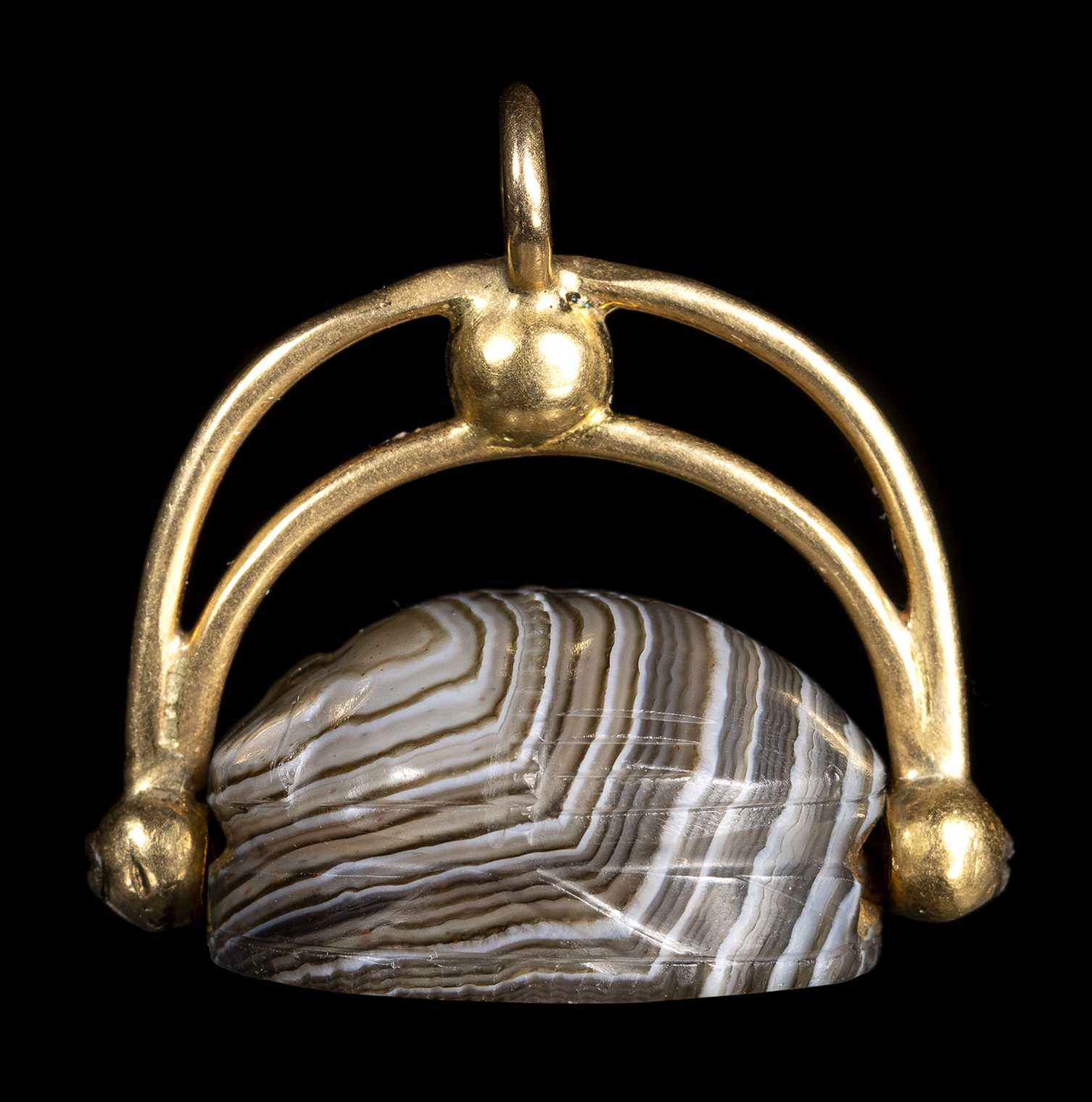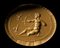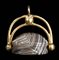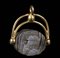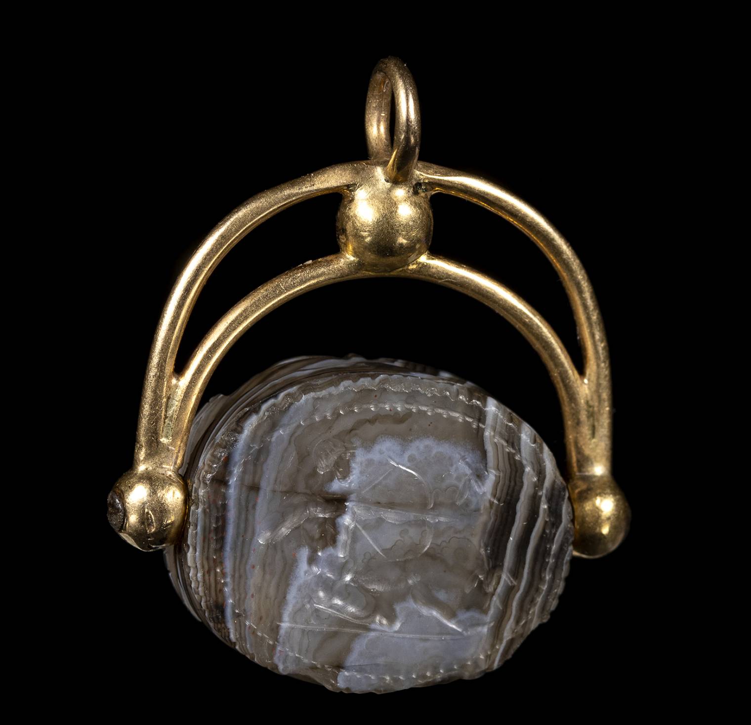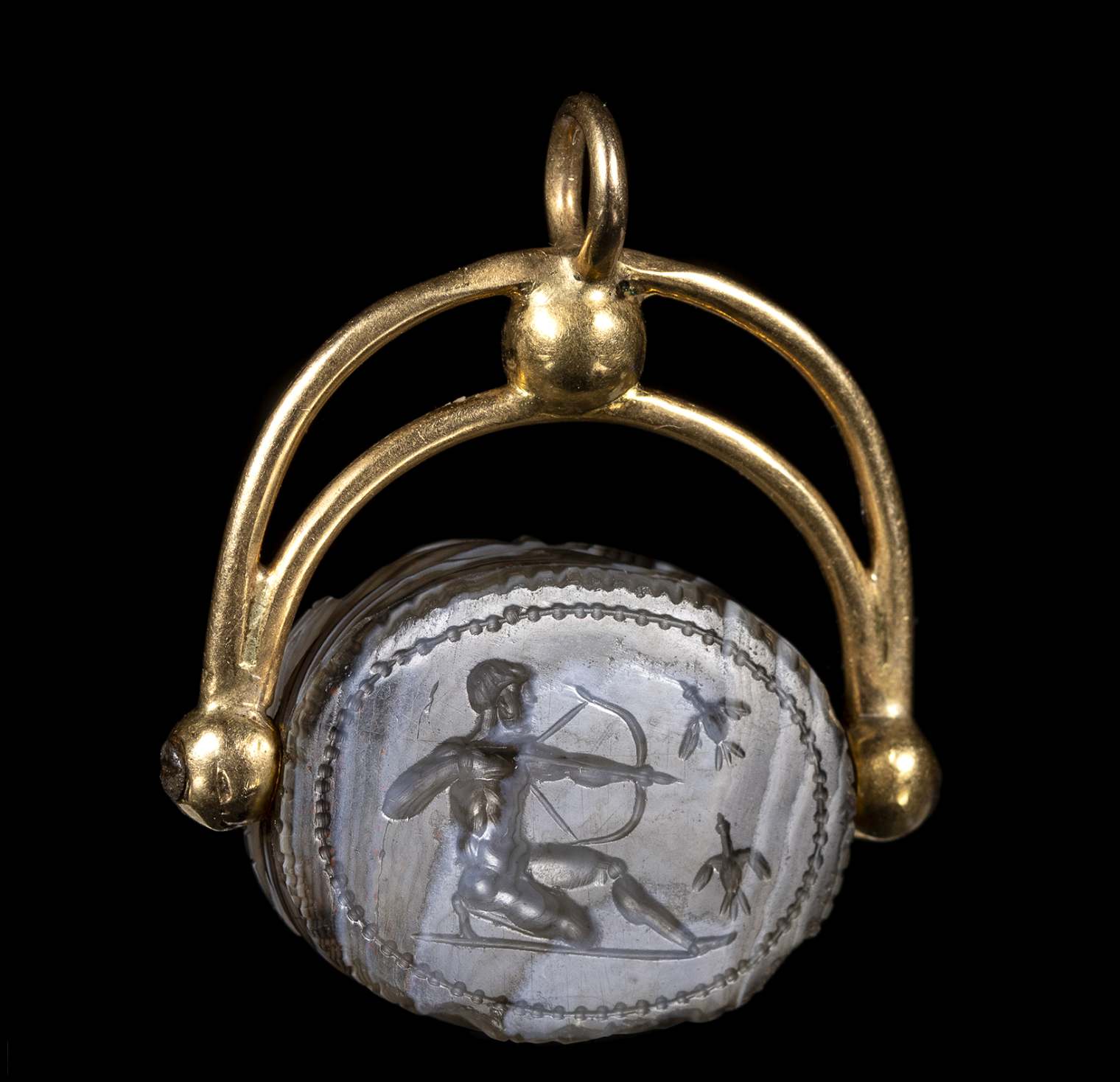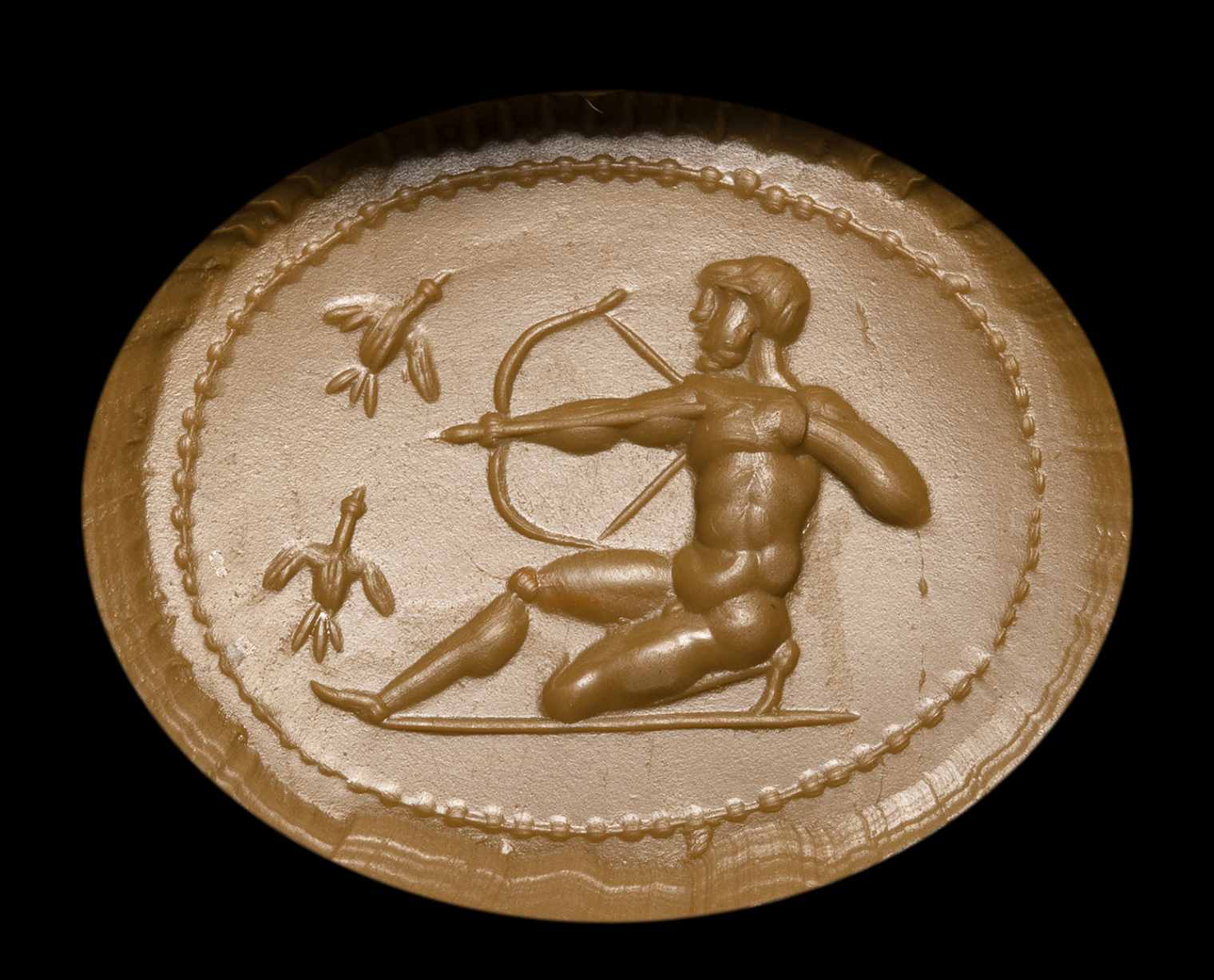 With stylized design in the back, the flat is engraved with the mythical hero bowing at two birds of the Stymphalian lake. Groundline. Dotted frame. Edge slightly chipped. Nice mirror polishing and wear marks. The scarab pierced lenghtwise is mounted on a 19th century gold swivel seal with suspension hole.