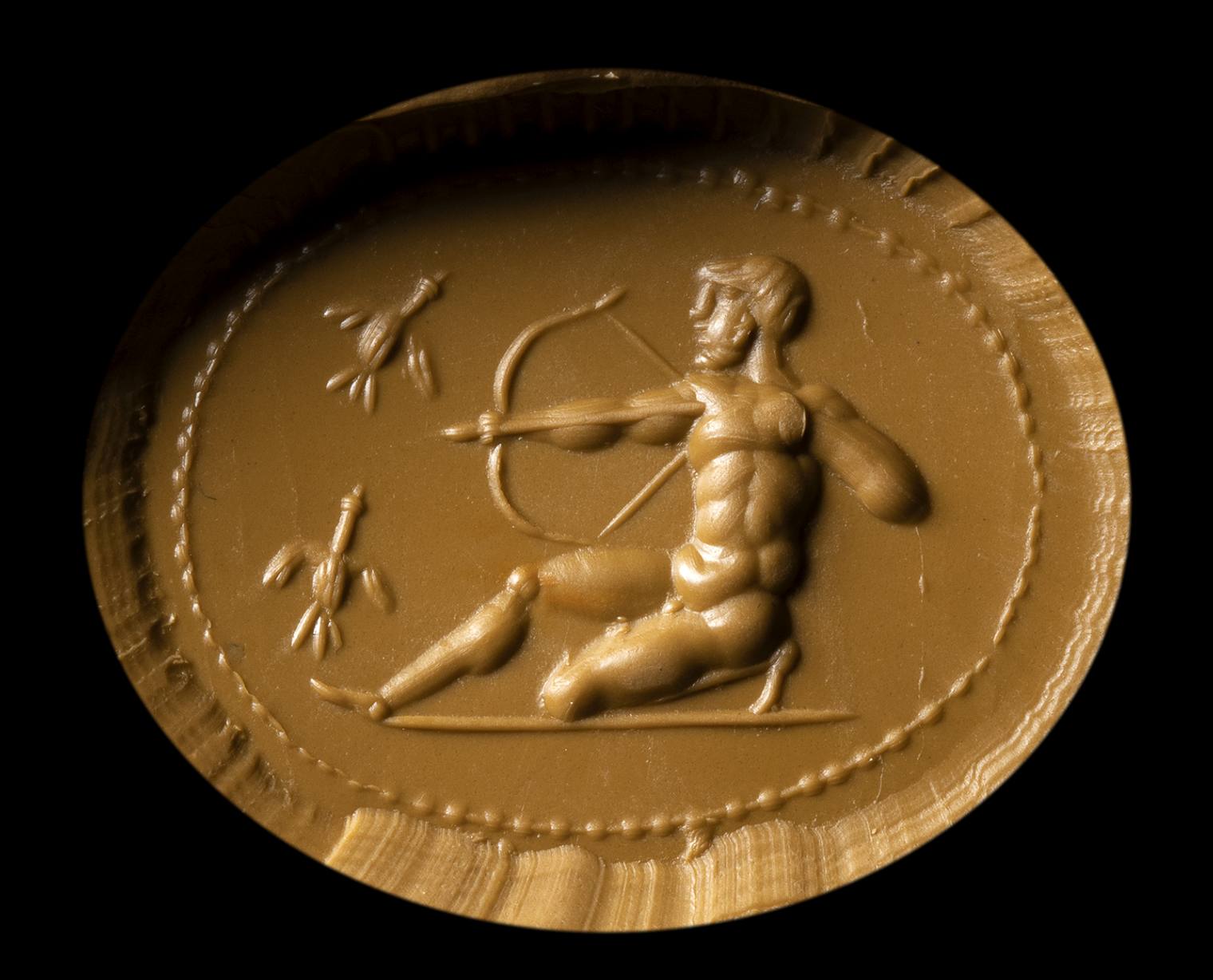 AN ITALIC BANDED AGATE SCARAB INTAGLIO. HERCULES KILLING THE STYMPHALIAN BIRDS.