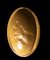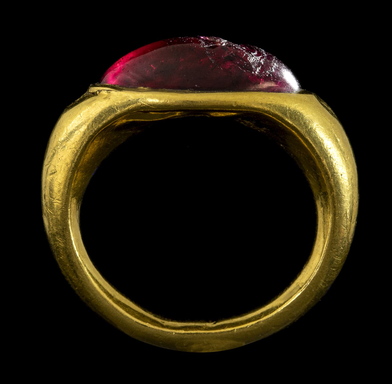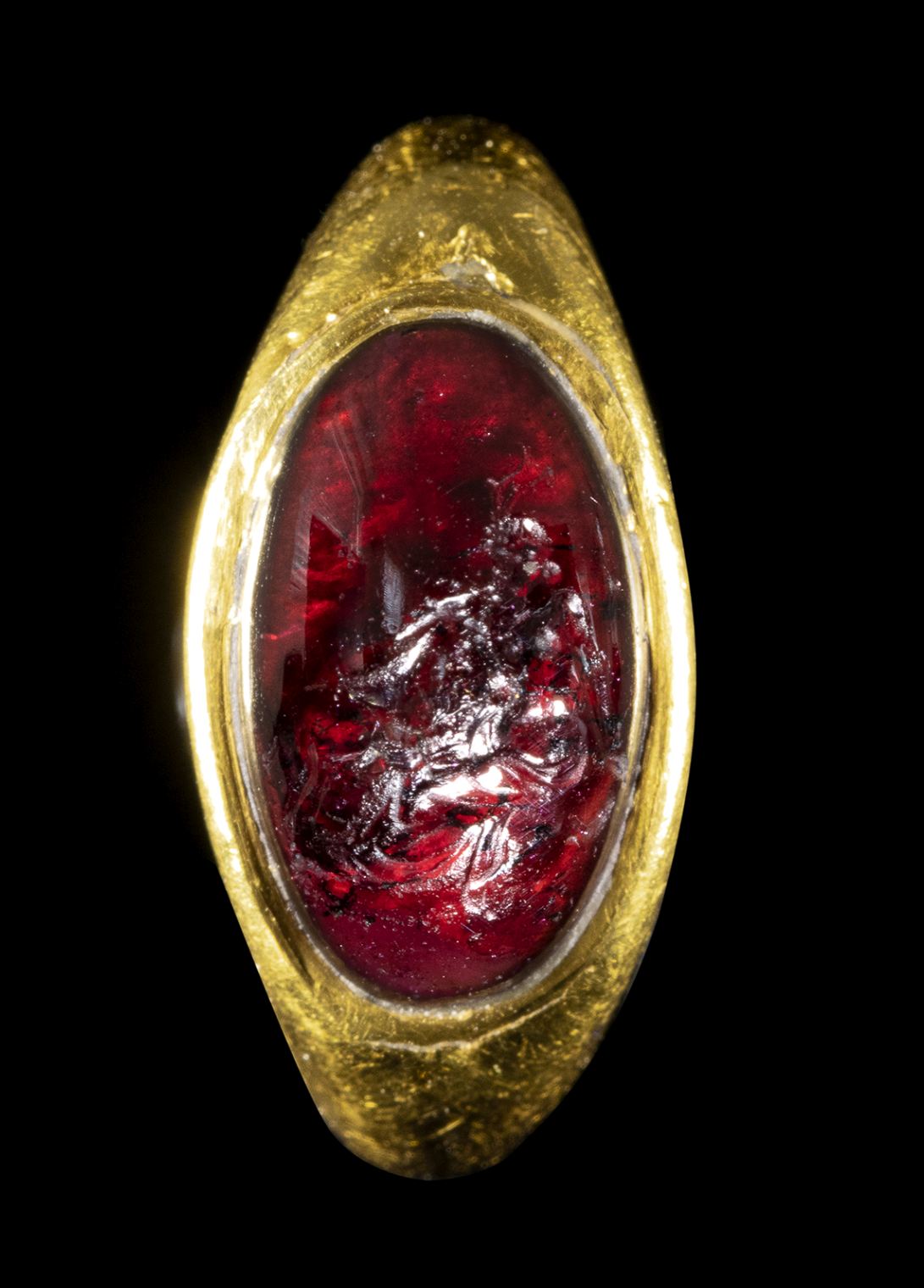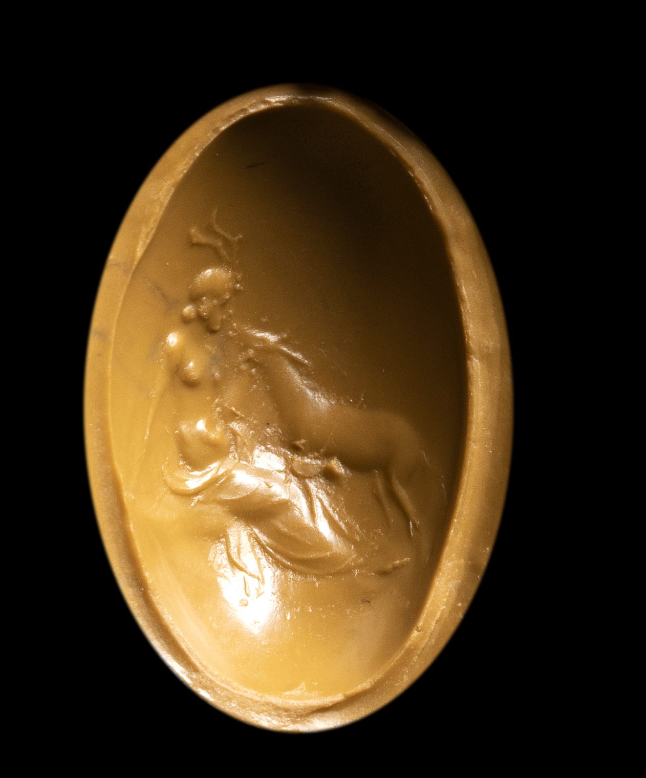 With hollowed rounded hoop, flatten within, expanding upwards and set with a large oval cabochon garnet.To the right, a seated female figure with uncovered bust and draped legs, probably a nymph. Deer antlers appear on her head. In front of her, on the left, a doe kisses her on the mouth. Unusual and rare scene. According to the myth, the transformation into a deer can be referred to a male figure (Actaeon). Fine execution. Wear marks.