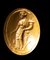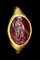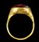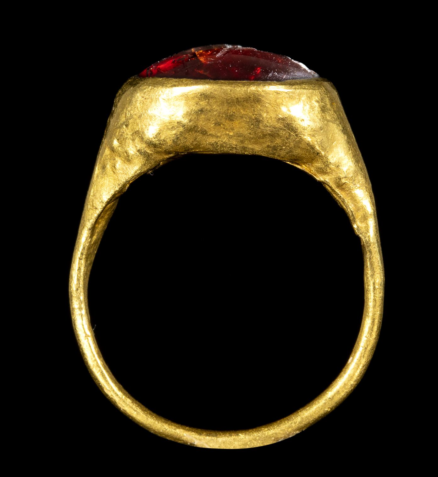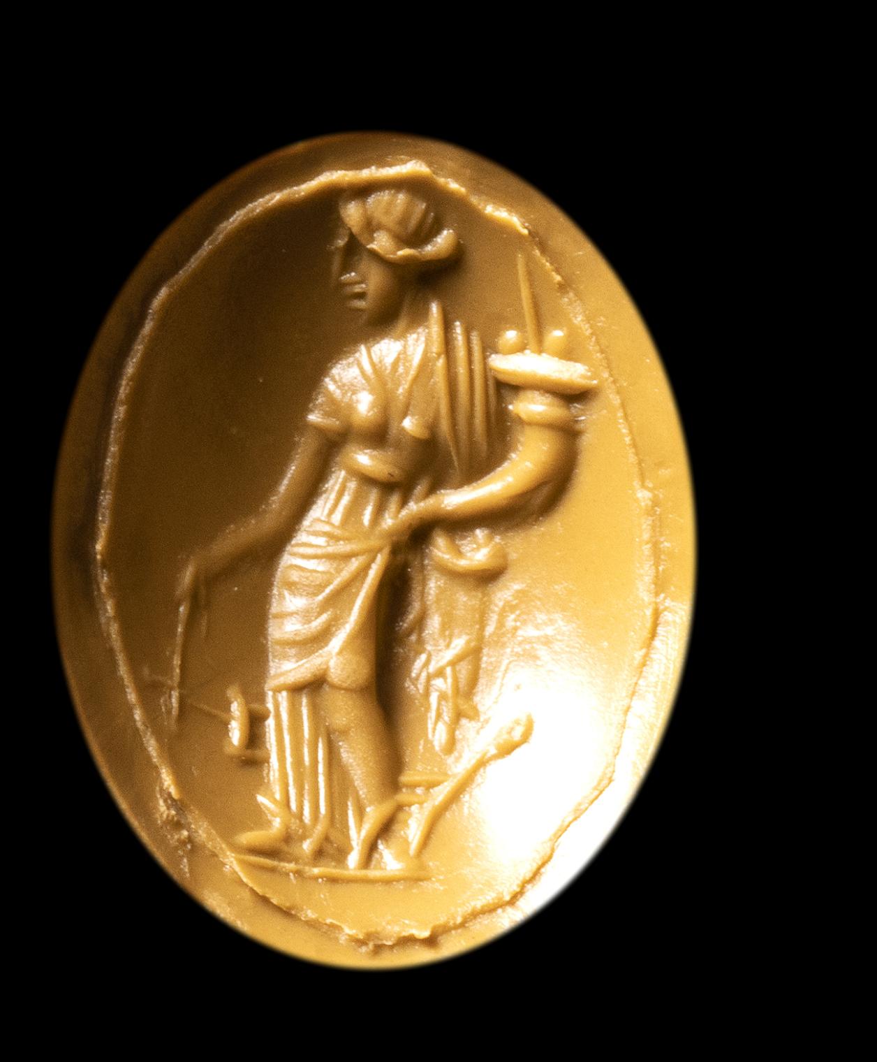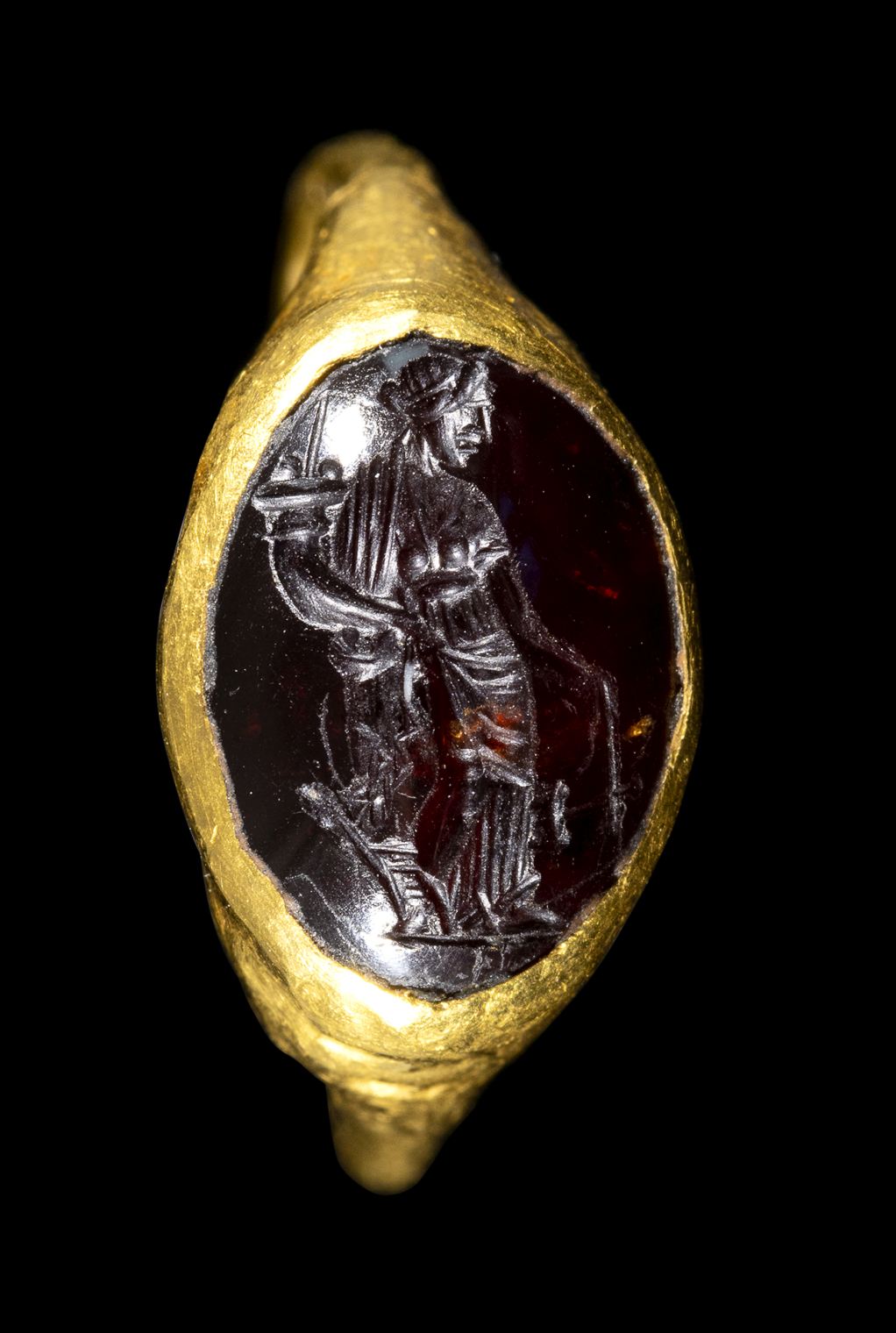 With hollowed rounded hoop expanding upwards in a high raised box-setting set with a garnet intaglio; Fortuna Tyche standing in three-quarters, her face facing right. She is tunicated and holds the cornucopia. Groundline. Wear marks.