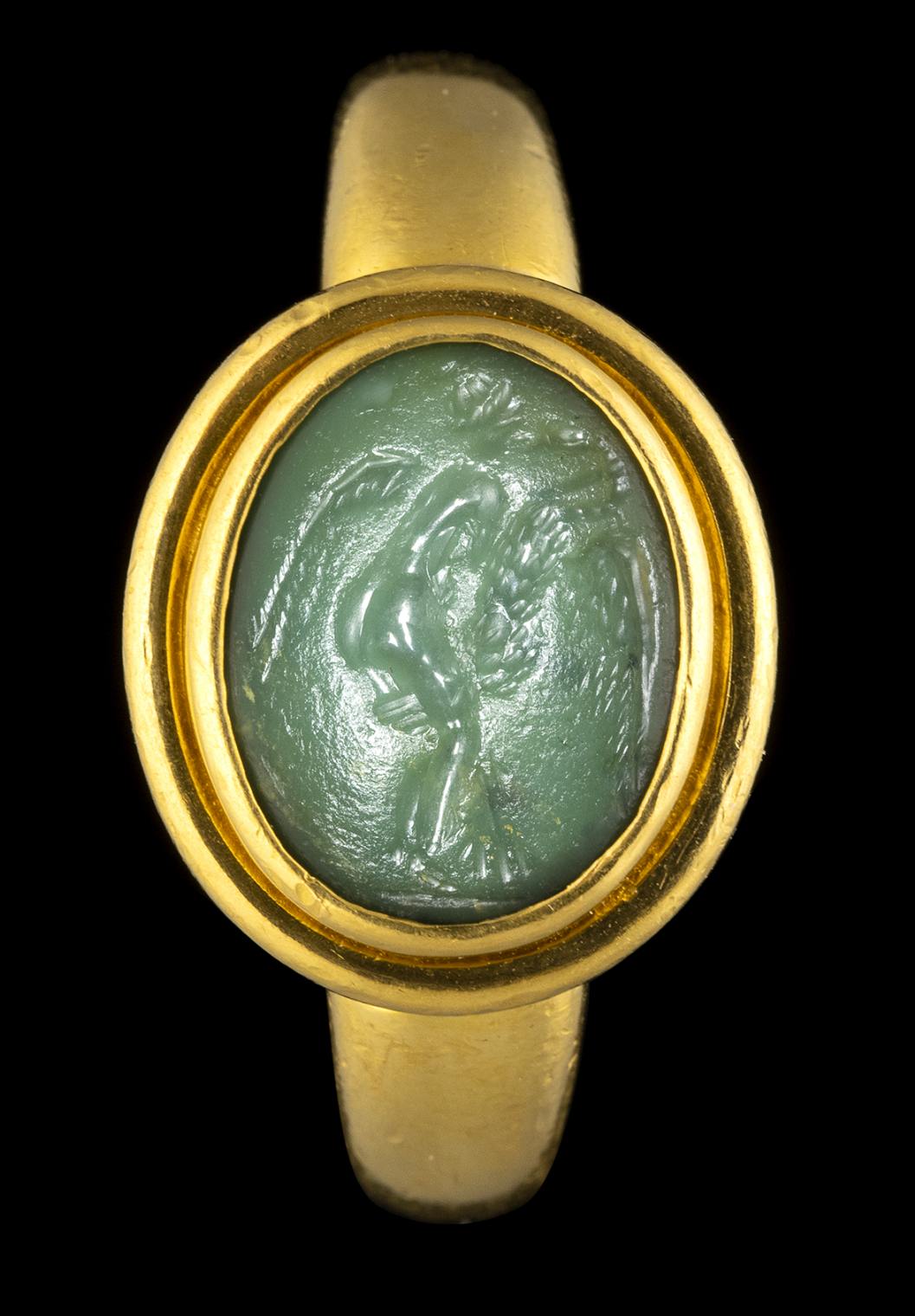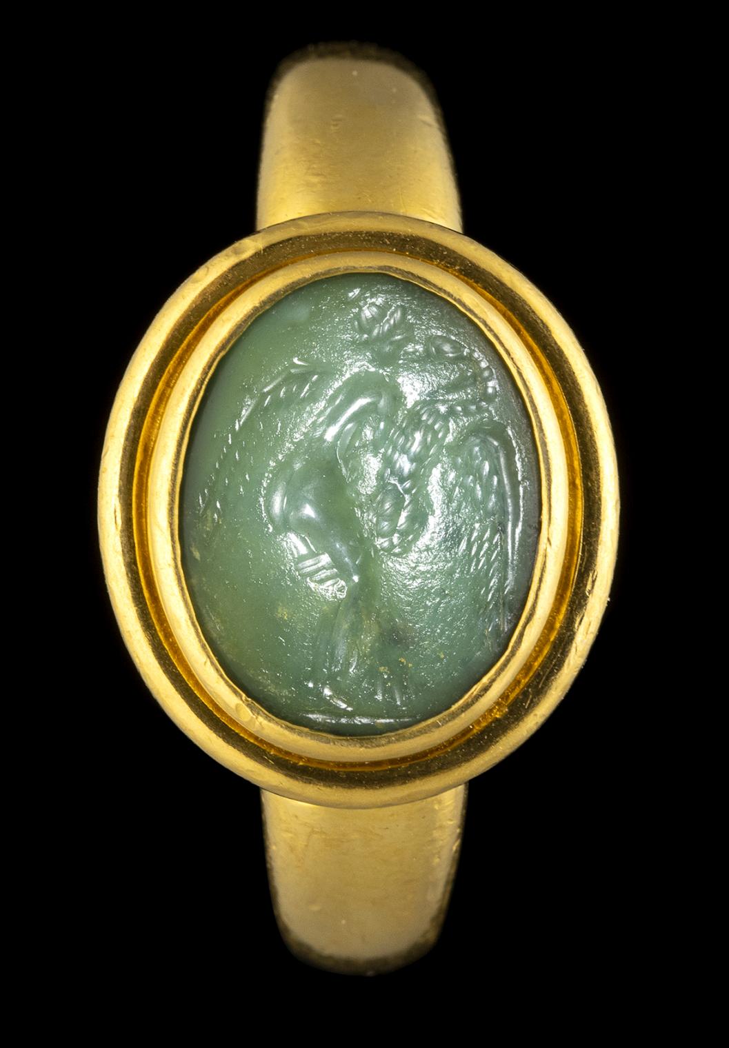A ROMAN GREEN CHALCEDONY INTAGLIO SET IN A MODERN GOLD RING. LEDA AND THE SWAN.