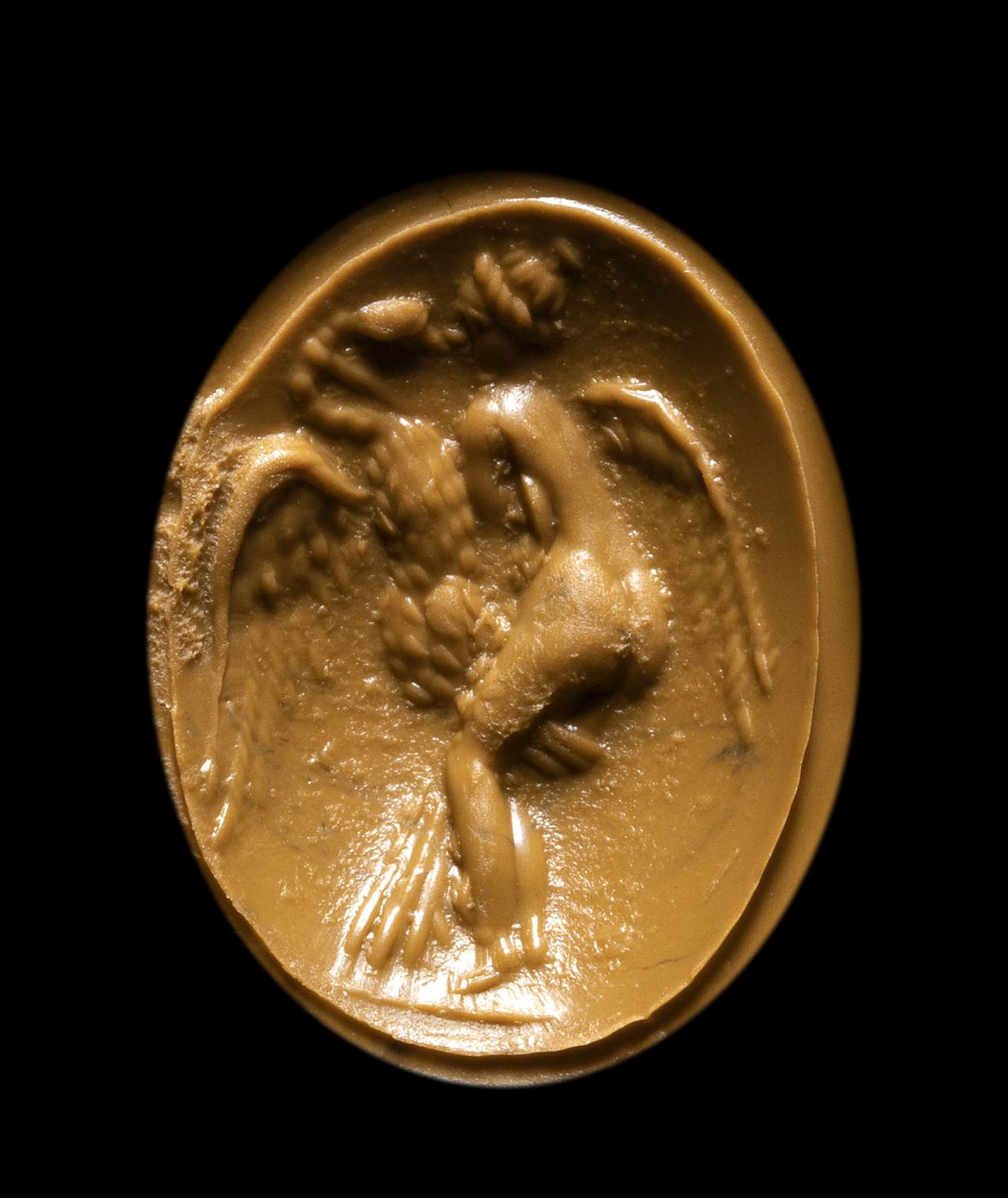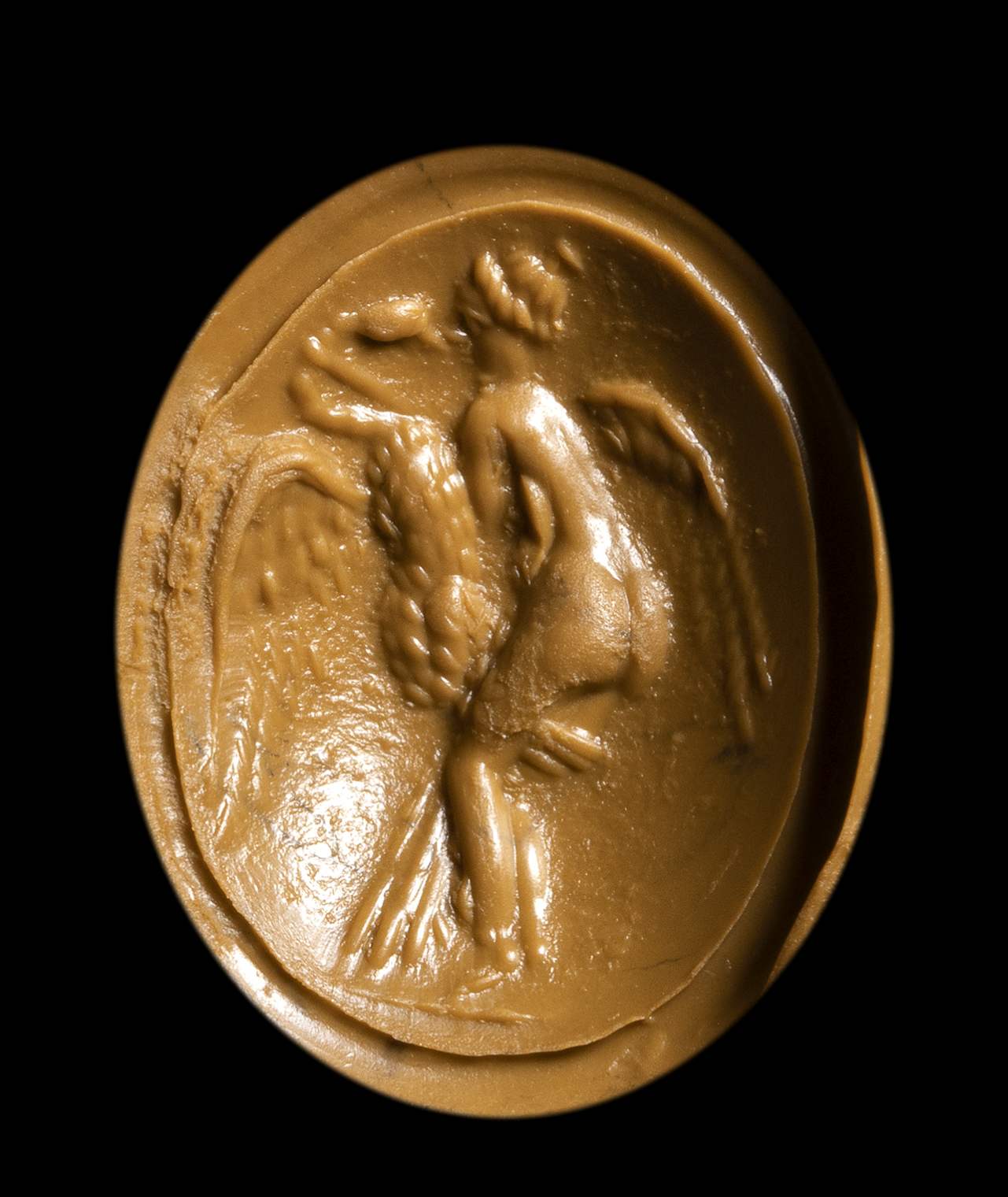 Beautiful and passionate erotic depiction of the sexual act between Leda and Zeus transformed into a swan, a celebrated episode from Ovid's Metamorphoses. The gem is slightly convex and vivid green in colour. Wear marks.