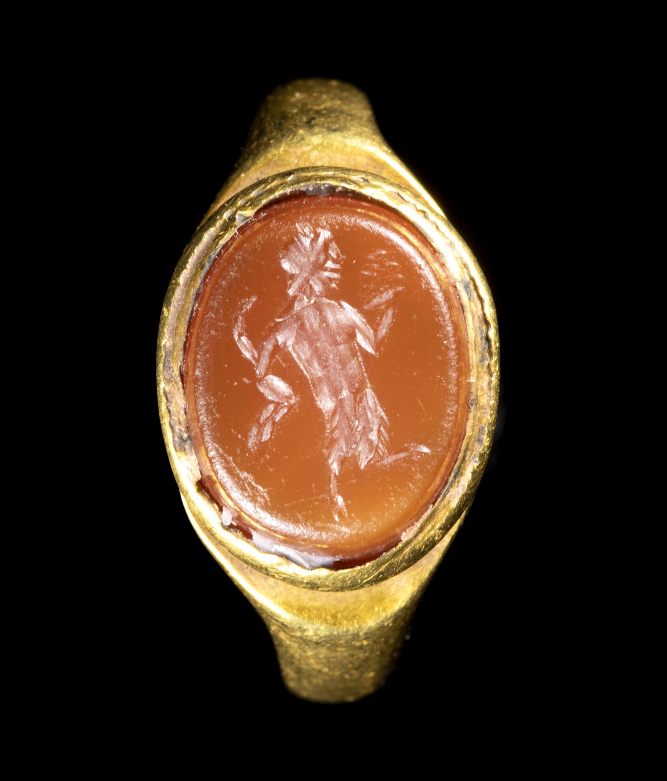 A ROMAN CARNELIAN INTAGLIO SET IN AN ANCIENT GOLD RING. SATYR.