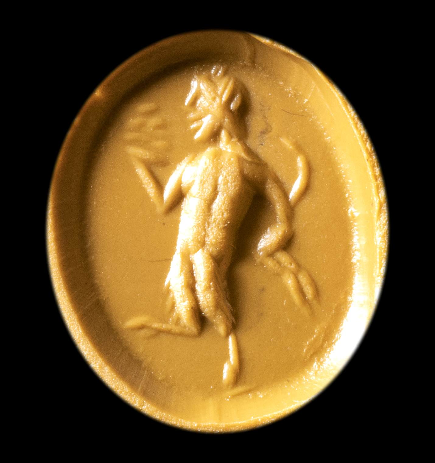 The satyr steps rightward, raising the left goat's paw; with the right hand holding the pedum and a drapery, while with the left hand he carries a plate with offerings. Bucolic and votive scene. Slight wear marks. The stone comes out of the edge of the golden bezel. Very good condition.
