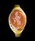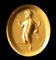 The satyr steps rightward, raising the left goat's paw; with the right hand holding the pedum and a drapery, while with the left hand he carries a plate with offerings. Bucolic and votive scene. Slight wear marks. The stone comes out of the edge of the golden bezel. Very good condition.