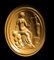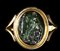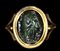 With a rounded hoop expanding in the shoulders in two branches and surmounting a grooved box setting with a chalcedony intaglio showing a woman facing left and seated on rocks. She is partially naked, the lower body covered by a folded drapery, her long hair tied behind in a bun. She is offering a laurel wreath to an idol on a column in front of her. Groundline. Wear marks. Nice vivid green color of the stone.