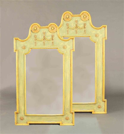 Coppia di specchiere rettangolari con cornici sagomate in legno laccato e dipinto, vecchia manifattura, cm. 146x83,5.