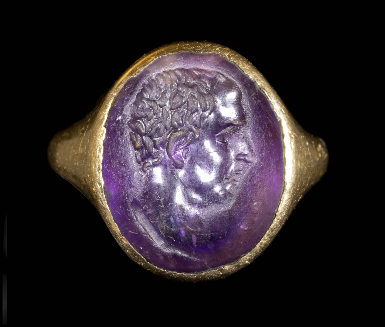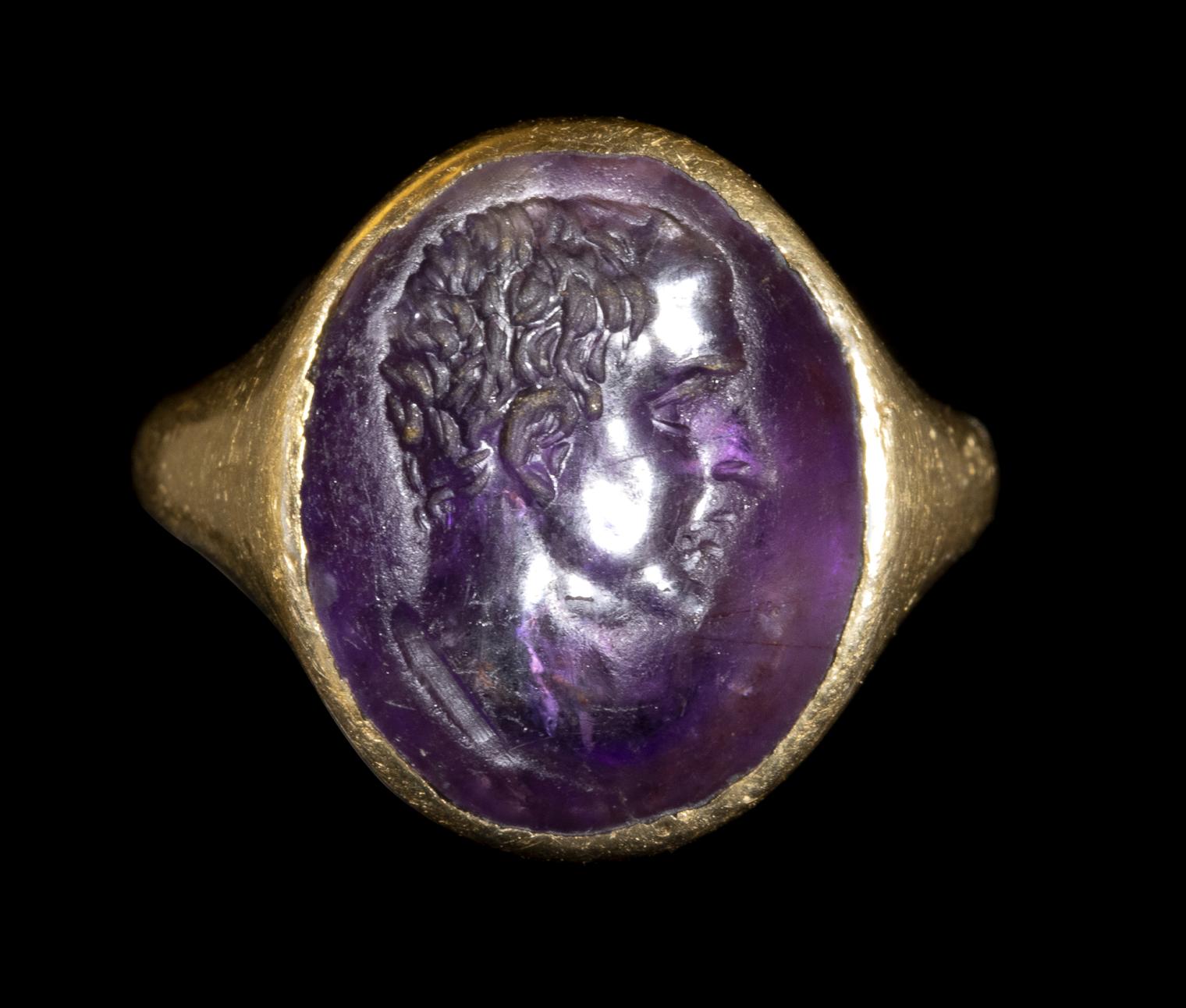 A ROMAN AMETHYST INTAGLIO SET IN A GOLD RING. MALE PORTRAIT.