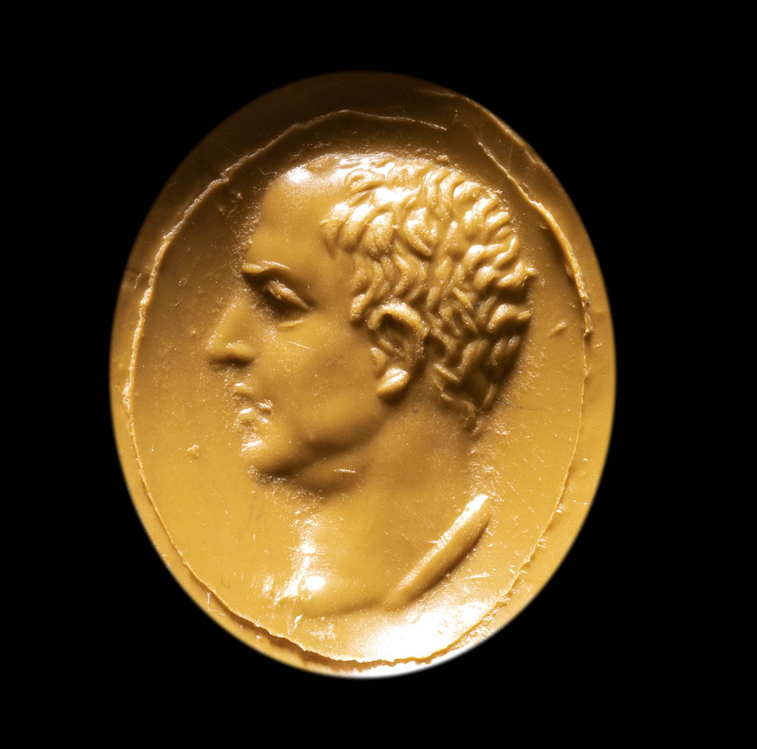 Portrait of a male character facing right, characterized by a partially bald skull above the forehead. These realistic physiognomic details can be referred to some portraits of Roman characters of the late Republican age, in particular of Cicero and Cato l'Uticense. Fine execution for the small size of the gem. Wear marks. Nice color of the stone.