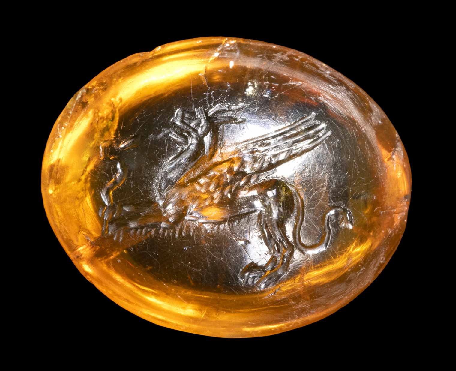 The winged creature faces left, in the act of killing a snake. The scene may also have an allegorical meaning. Extraordinary variety of citrine, convex on both sides, characterized by a very bright light. Small chips. Wear marks. Rare.
