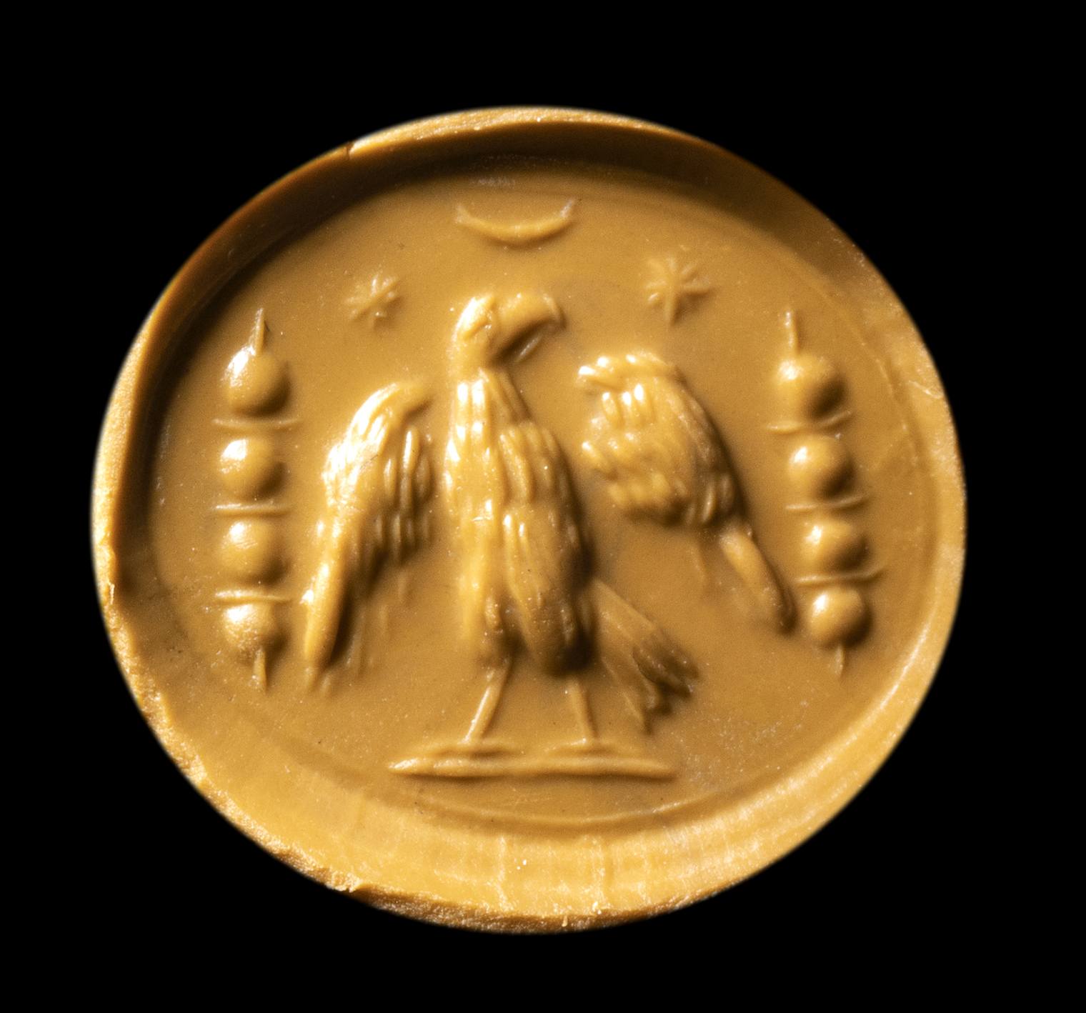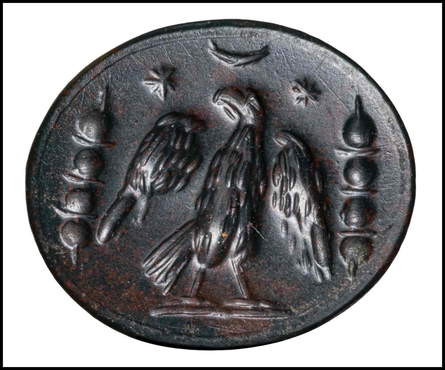 A ROMAN BLOODSTONE INTAGLIO. EAGLE WITH MILITARY INSIGNIA, CRESCENT MOON AND STARS.