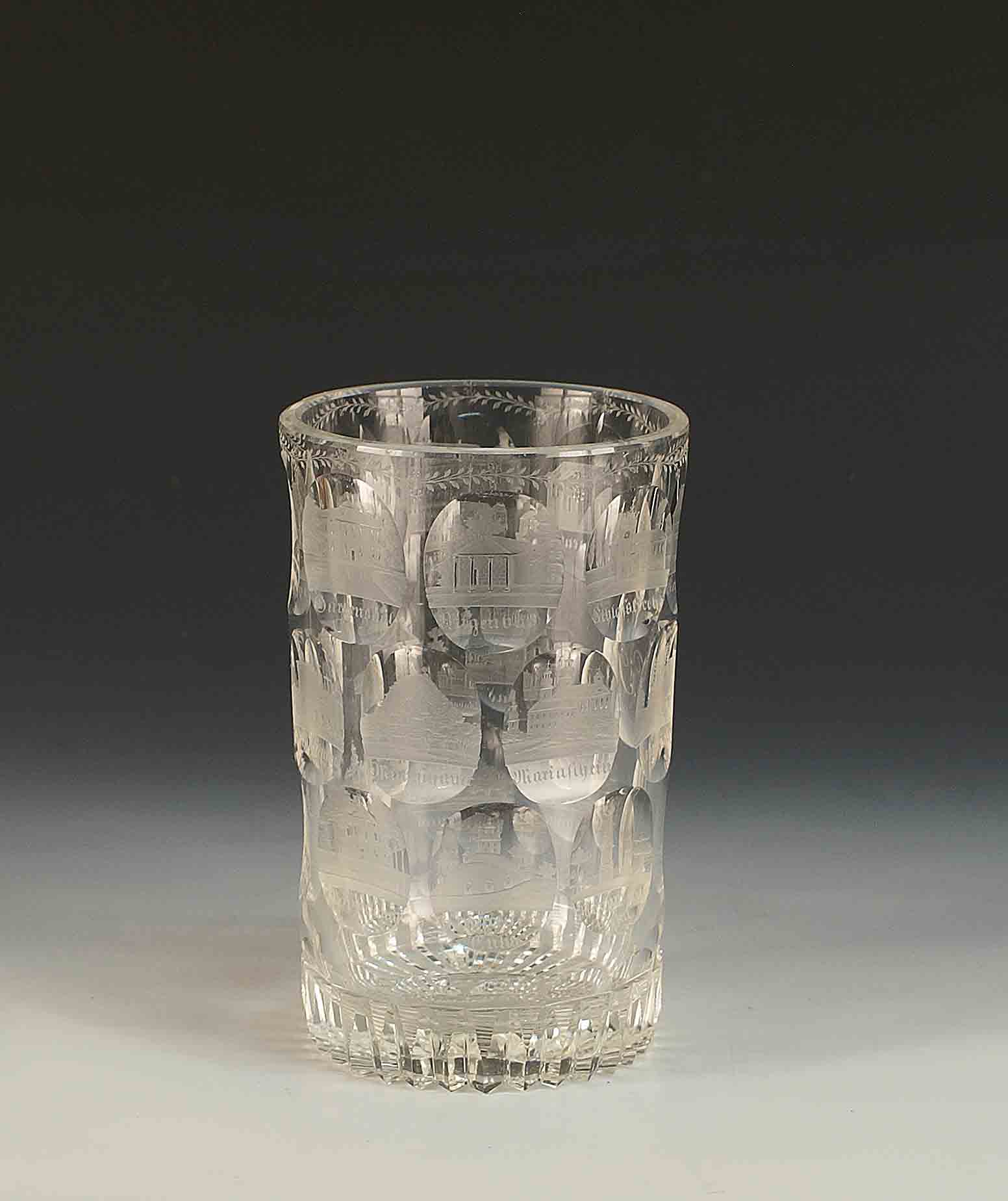 Boccale in vetro inciso e molato a raffigurare località della Germania,...