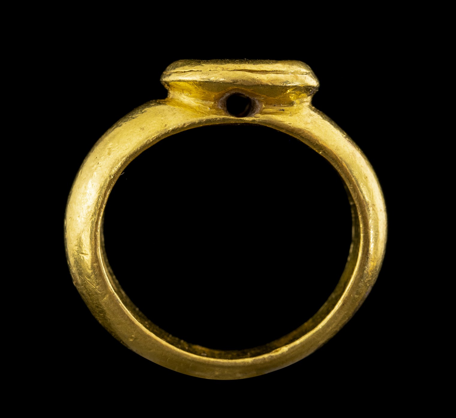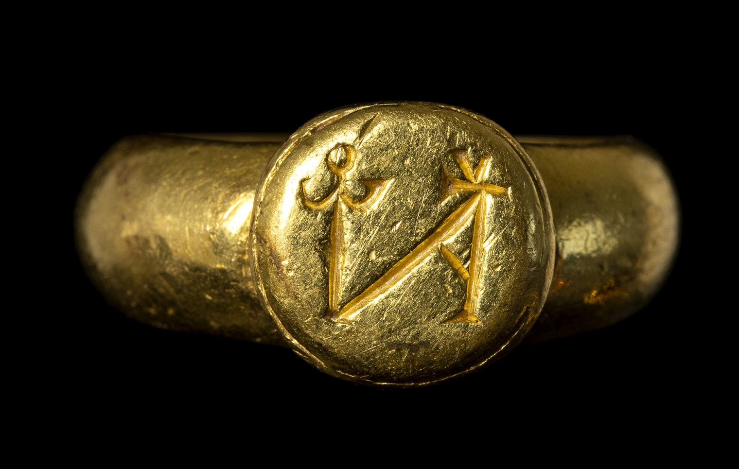 With massive rounded hoop, flatten within and pierced under the rounded raised bezel with grooved section and engraved with a monogramm. Wear marks.