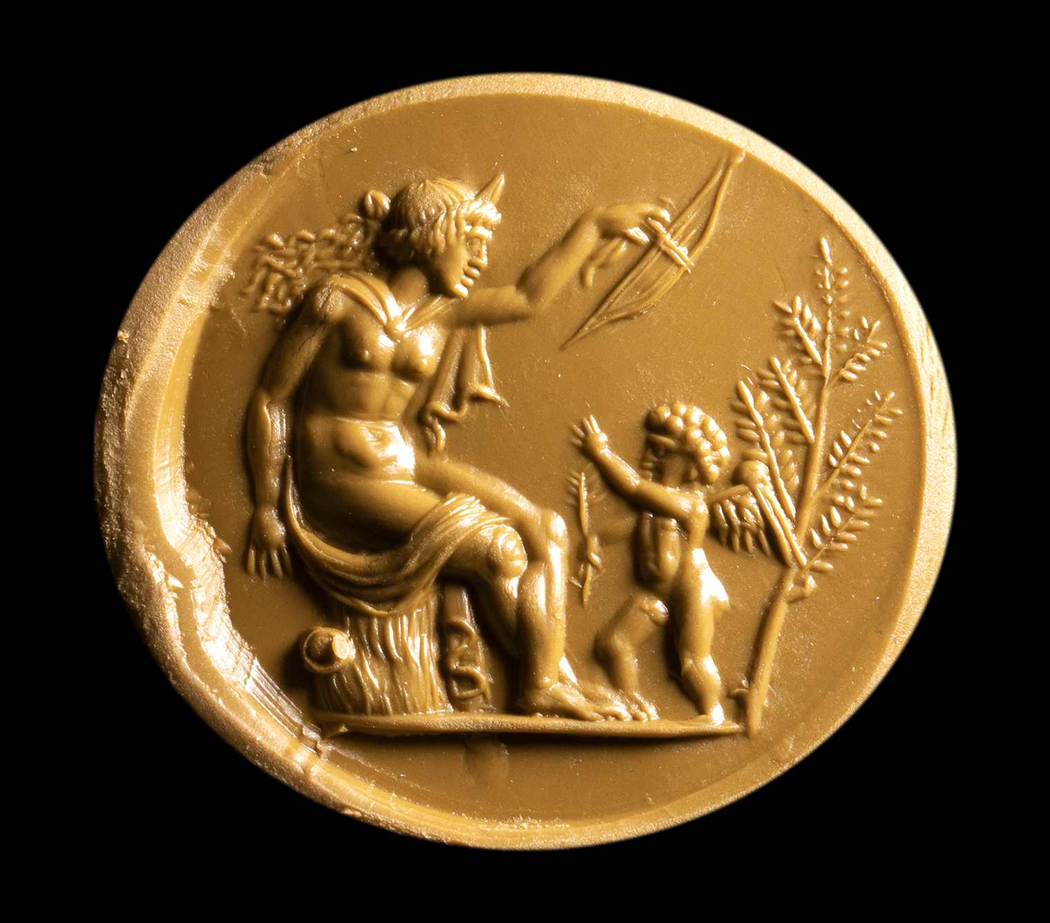 Beautiful mythological scene composed of Venus playing with Cupid's weapons. The goddess of Love is seated in the right side, facing left, in the act of lifting the bow above the little Eros who tries to grasp it. The young boy is winged and holds an arrow in his left hand. Next to him, a small tree. The female figure is naked but with a cloak that partially covers her, and shows her feet crossed in a very elegant pose. Missing and chips on the edge. Wear marks.