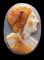 Interesting bust of Bacchante, facing right, with face slightly upwards. The hair and tunic are engraved in the orange layer of the agate, the face, neck and bust in the white layer (except for the cheek specially characterized by a trace of the orange layer); the bottom layer is transparent with white dots. The head is crowned with a crown of ivy. The stone is very thin, and is slightly cracked. Small missing on the edge.
