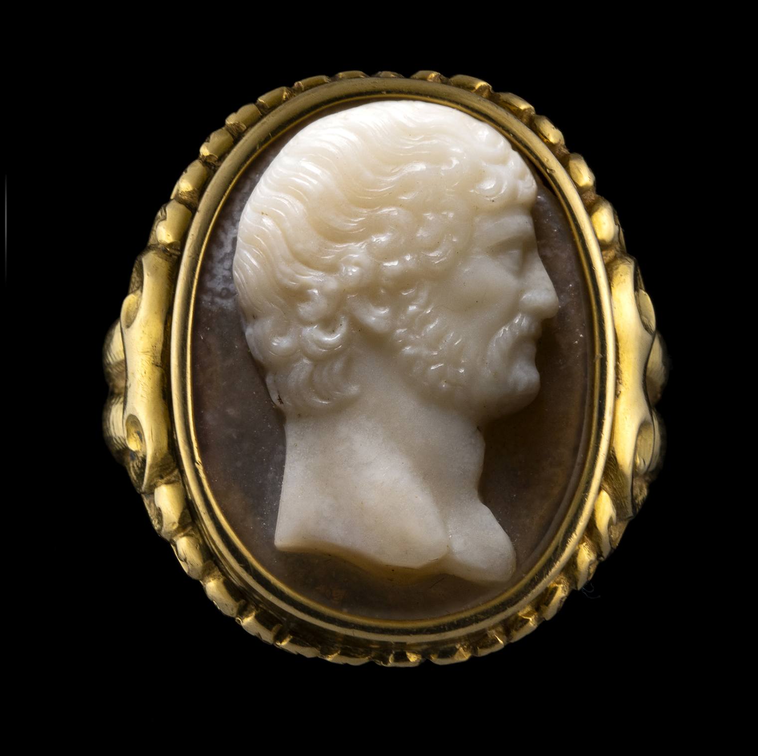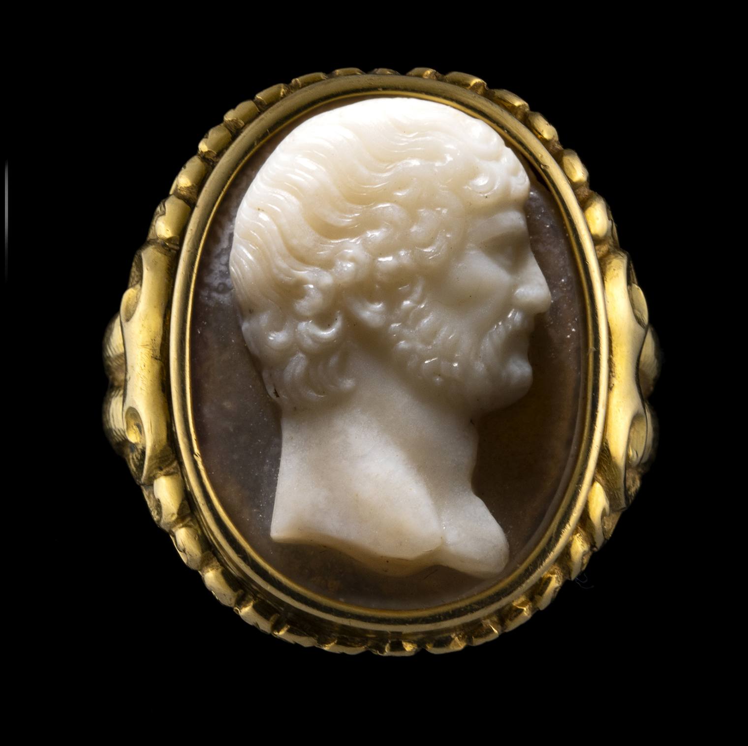 A POSTCLASSICAL AGATE CAMEO SET IN A GOLD RING. PORTRAIT OF THE EMPEROR HADRIAN.