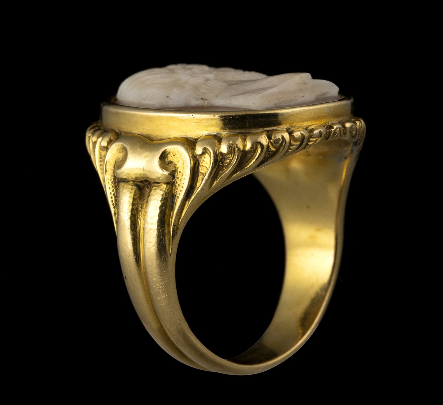 Idealized portrait without laurel wreath of the Roman emperor Hadrian, facing right. The effigy is characterized by thick hair and a muscular neck. The cameo is mounted in a gold ring decorated with plant patterns.