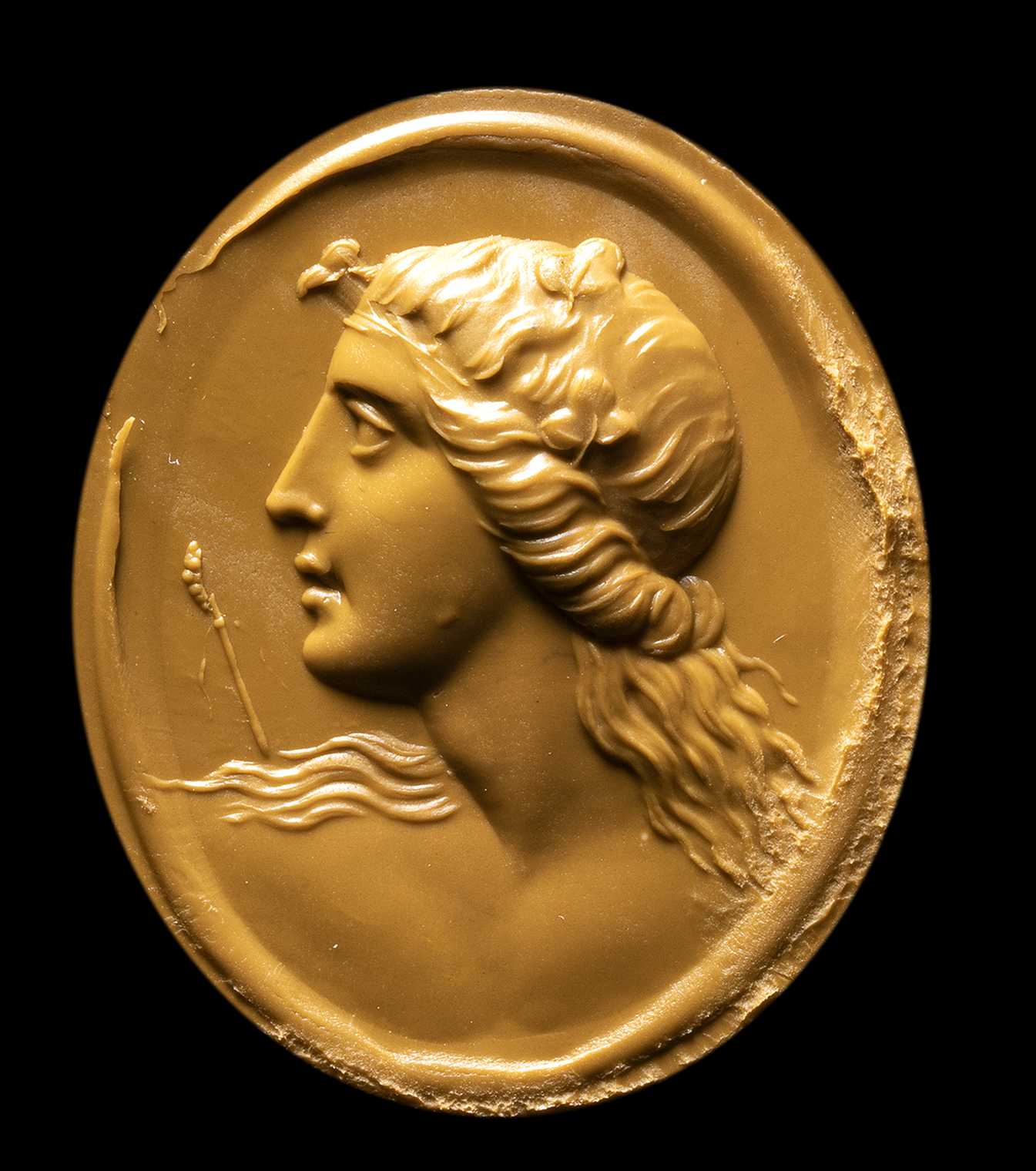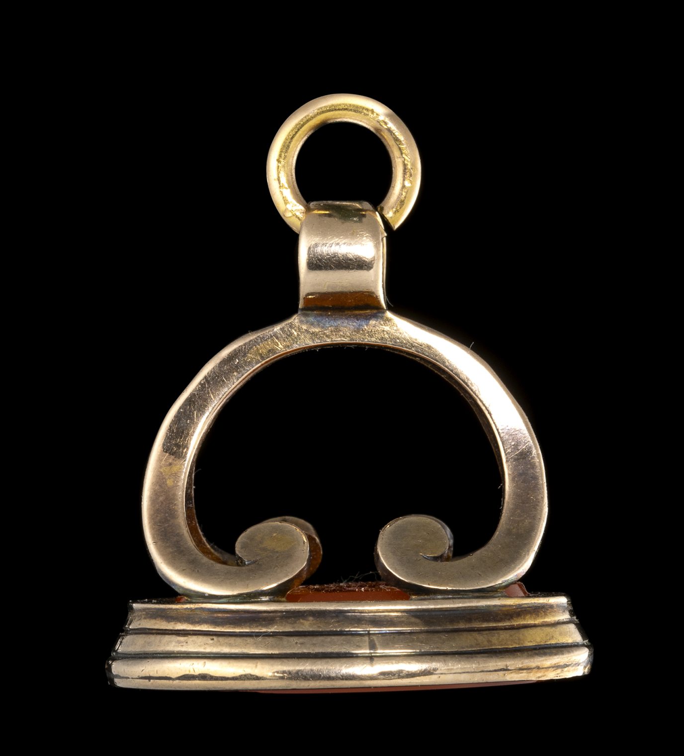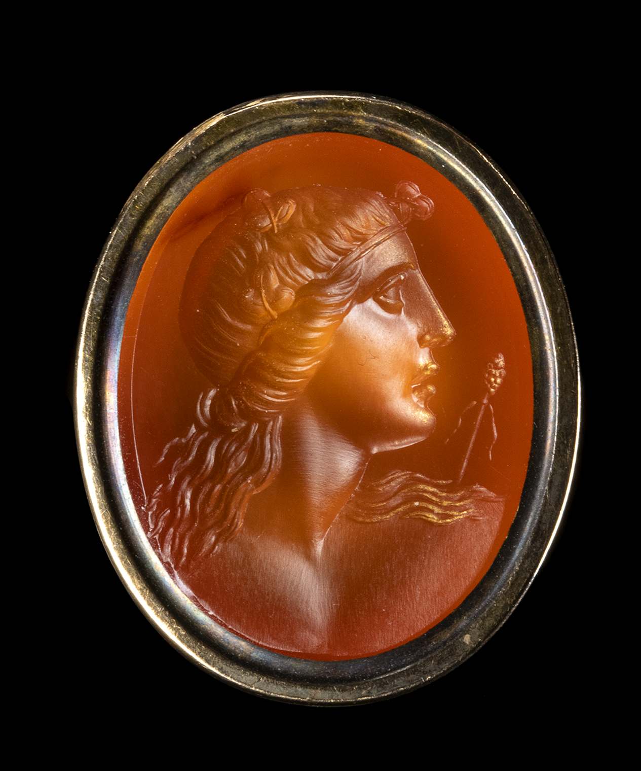 A NEOCLASSICAL CARNELIAN INTAGLIO SET IN A GOLD FOB SEAL. BUST OF MAENAD.