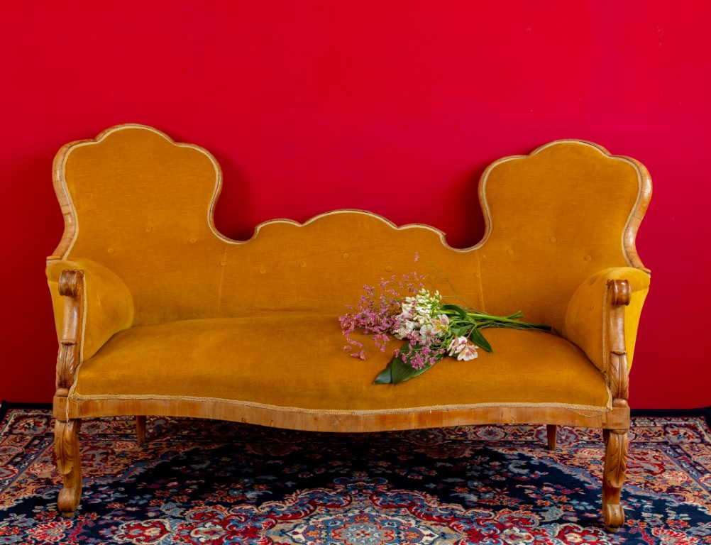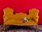 a tre posti, spalliera e braccioli sagomati, imbottito e rivestito in velluto ocra, gambe mosse
