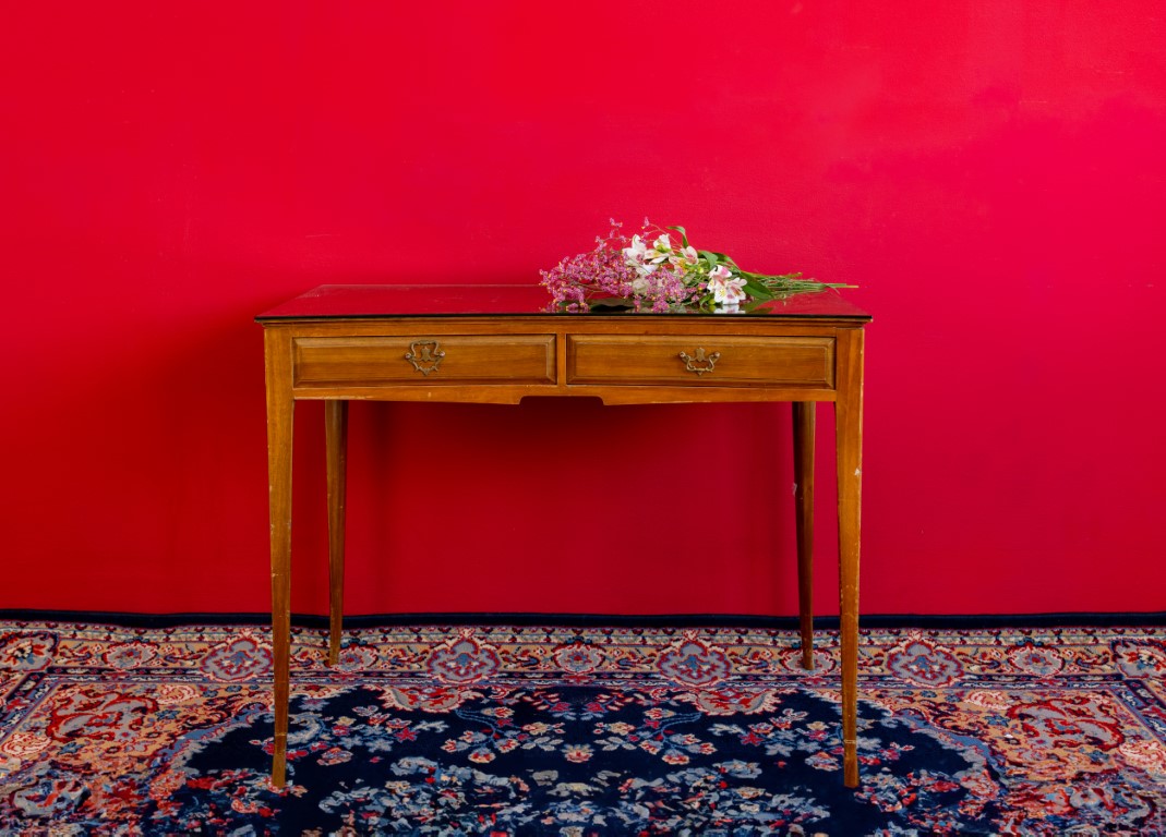 realizzata con piano rettangolare, due cassetti, gambe troncopiramidali