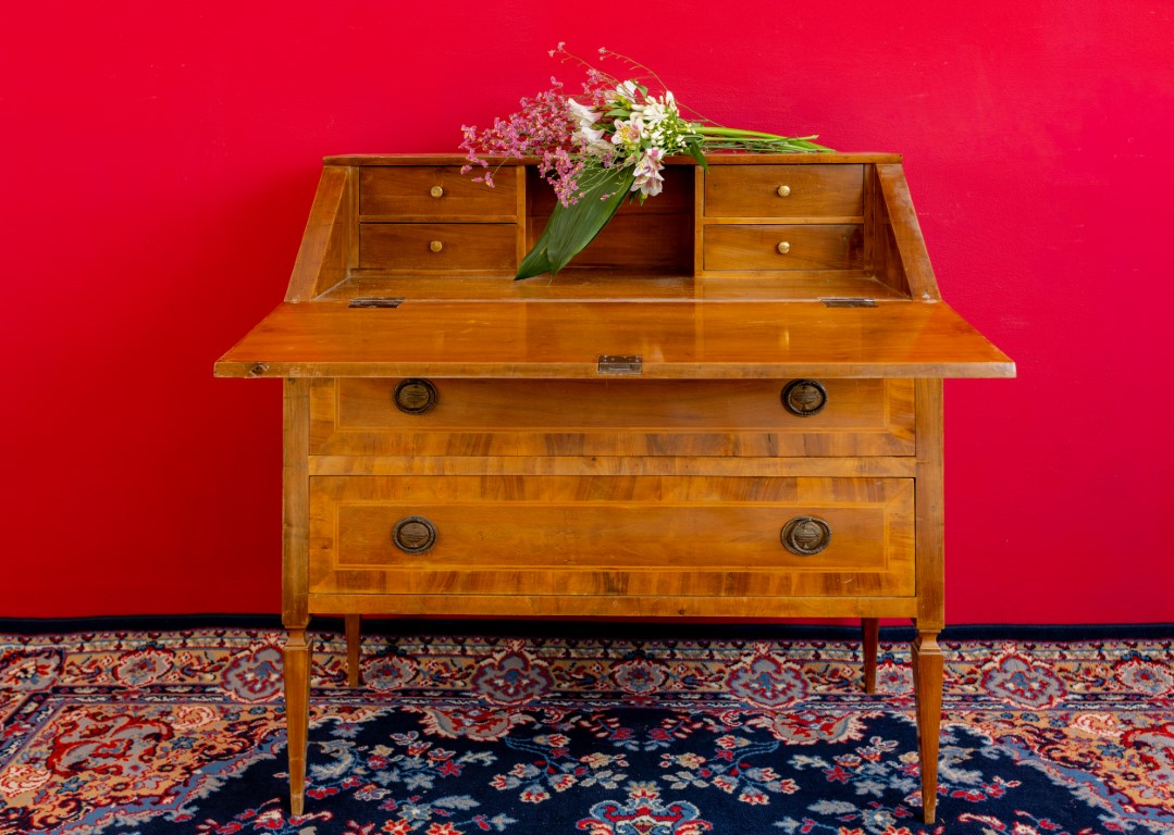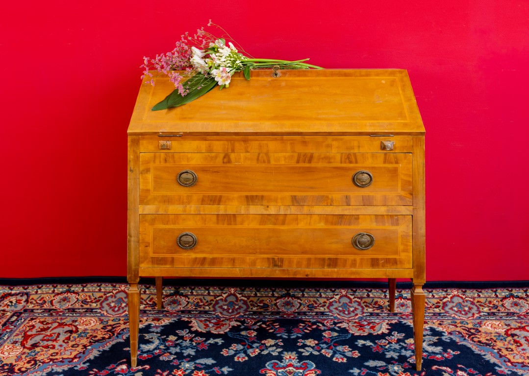 realizzato in stile settecentesco, fronte a due cassetti e ribalta con all¿interno vano a giorno e quattro cassettini, gambe troncopiramidali