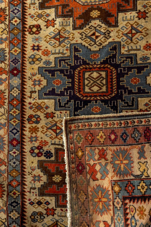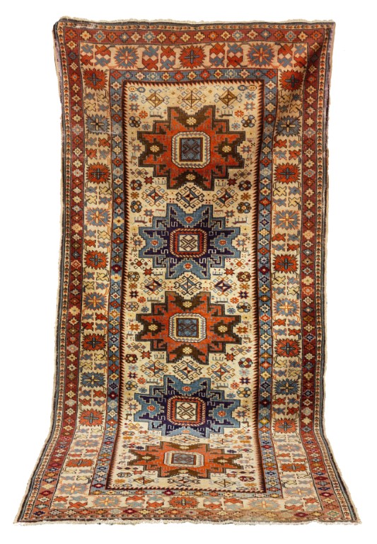 cinque medaglioni centrali nei toni alternati dell'arancio e del celeste su campo avorio