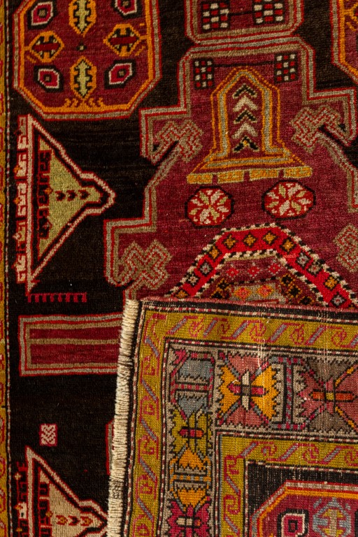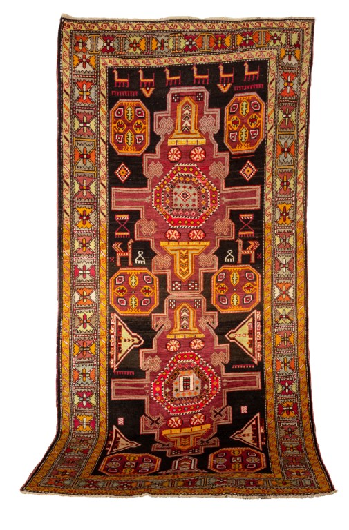 realizzato a motivi geometrici nei toni del fucsia, dell'arancio e del rosa su fondo marrone