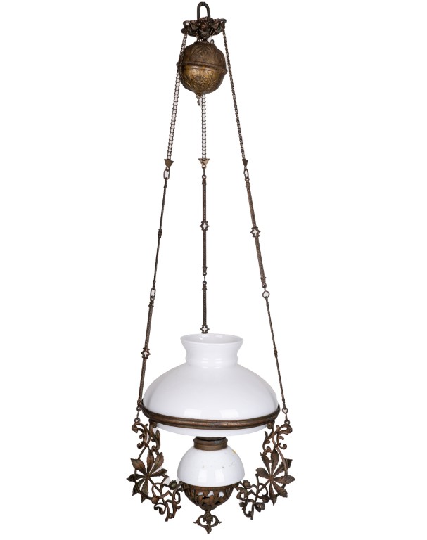 Lampadario a saliscendi a petrolio in opalina bianca e bronzo dorato