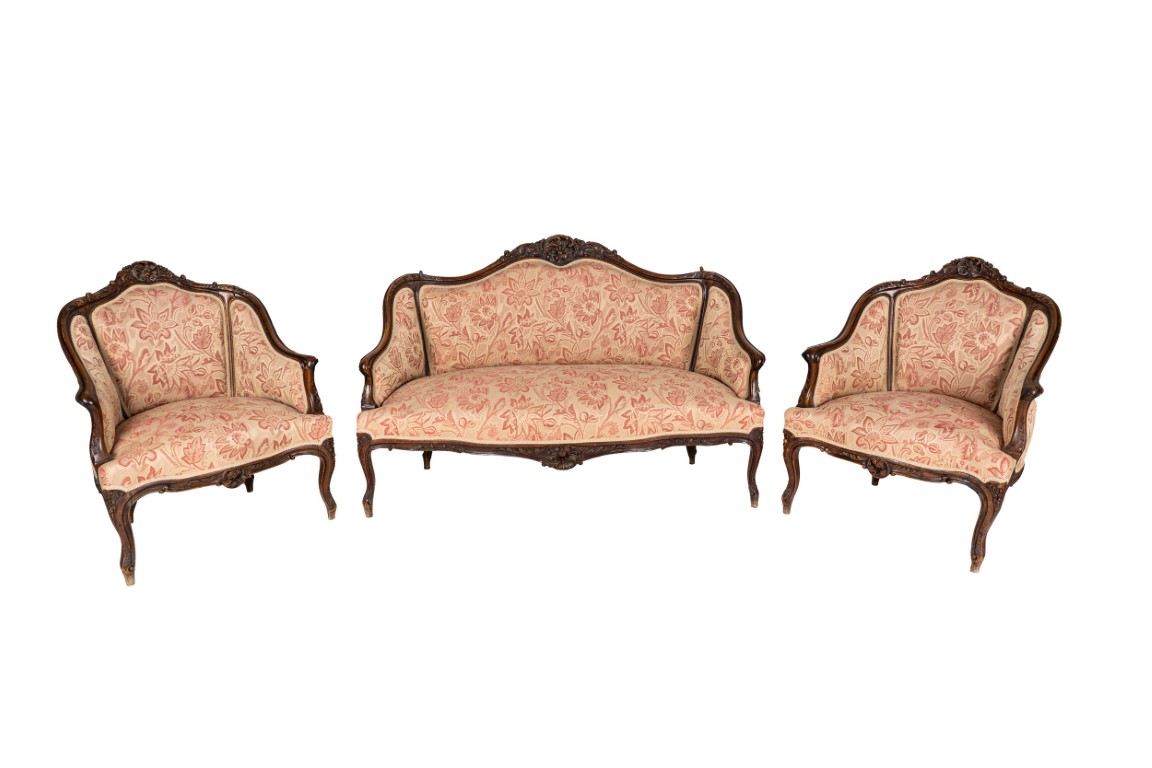 Divanetto e due poltroncine a pozzetto in noce intagliato
