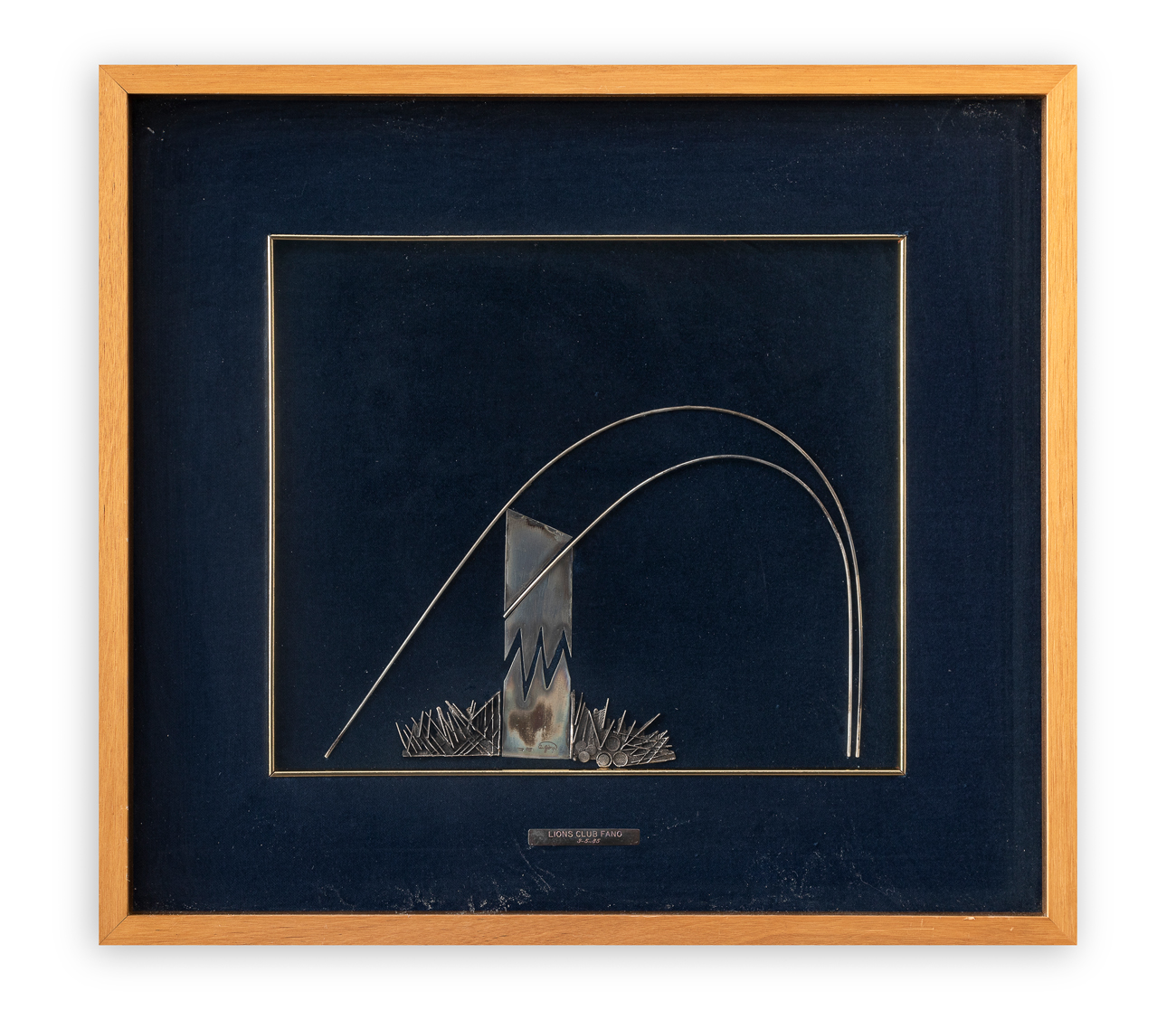 Bassorilievo composto da elementi in argento su fondo in tessuto blu