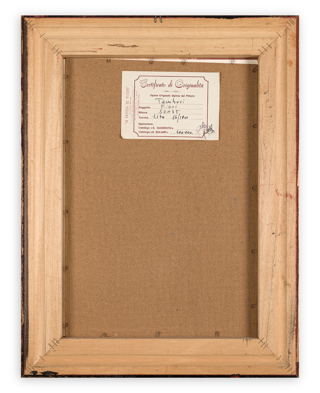 Certificato di originalità La Bottega del Pittore Riccione al retro