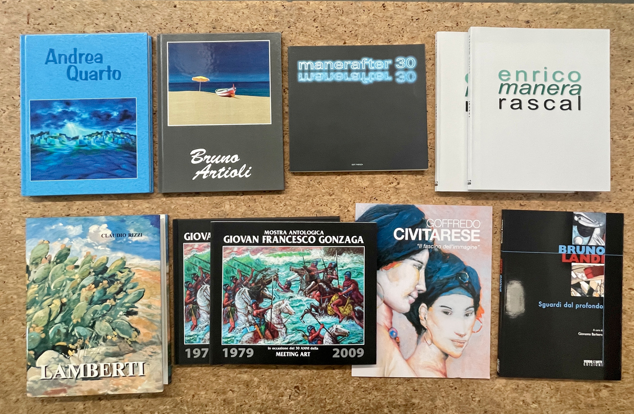 Lotto unico di 10 cataloghi riccamente illustrati relativi ad esposizioni personali dei seguenti artisti: Lamberto Lamberti, Enrico Manera (3), Giovan Francesco Gonzaga (2), Andrea Quarto, Goffredo Civitarese, Bruno Landi e Bruno Artioli