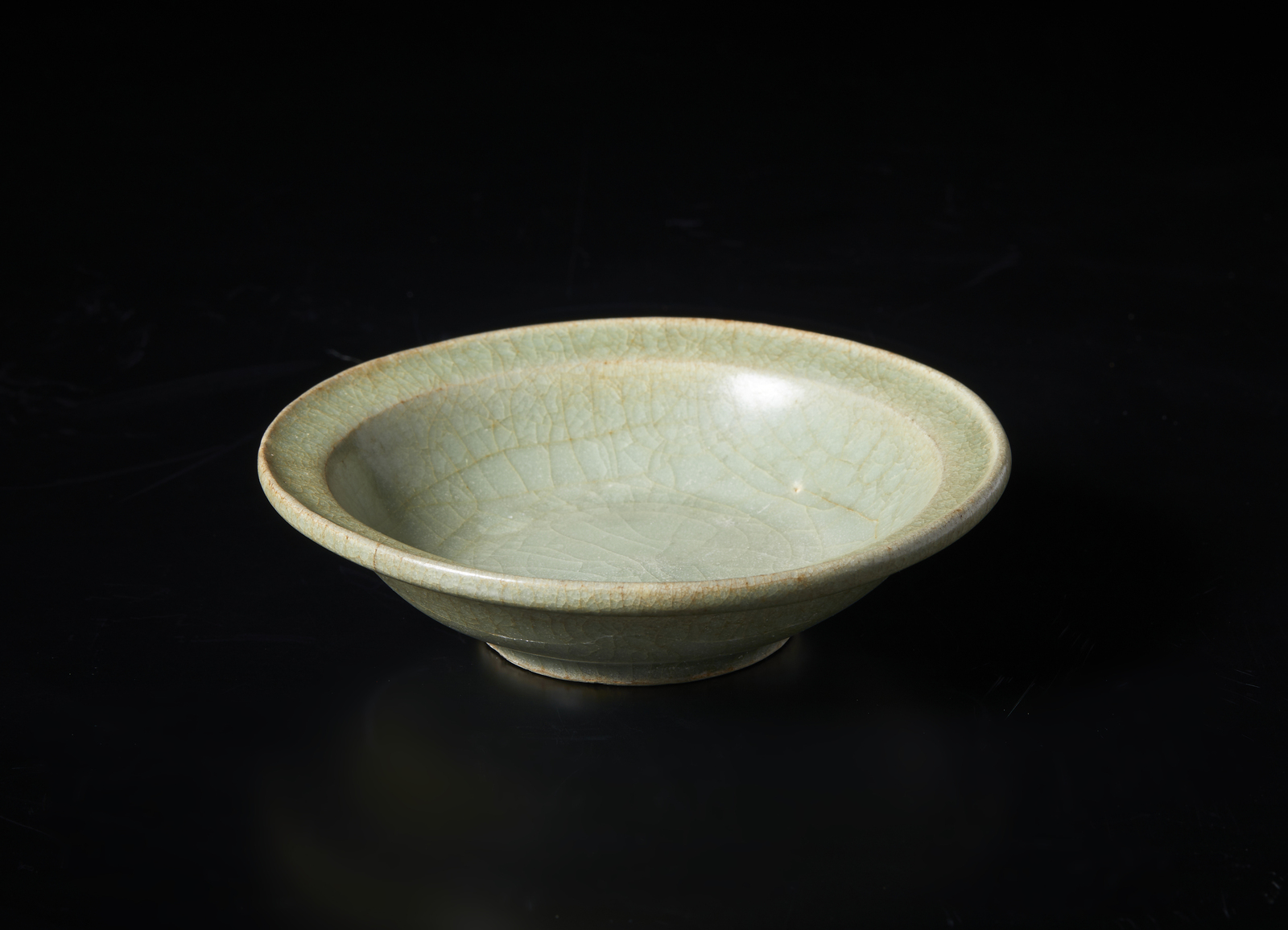 Cina, Song (?), XII secolo. . Cm 13,40 x 3,30. piccolo piatto in porcellana interamente coperto da smaltatura verde pallido.