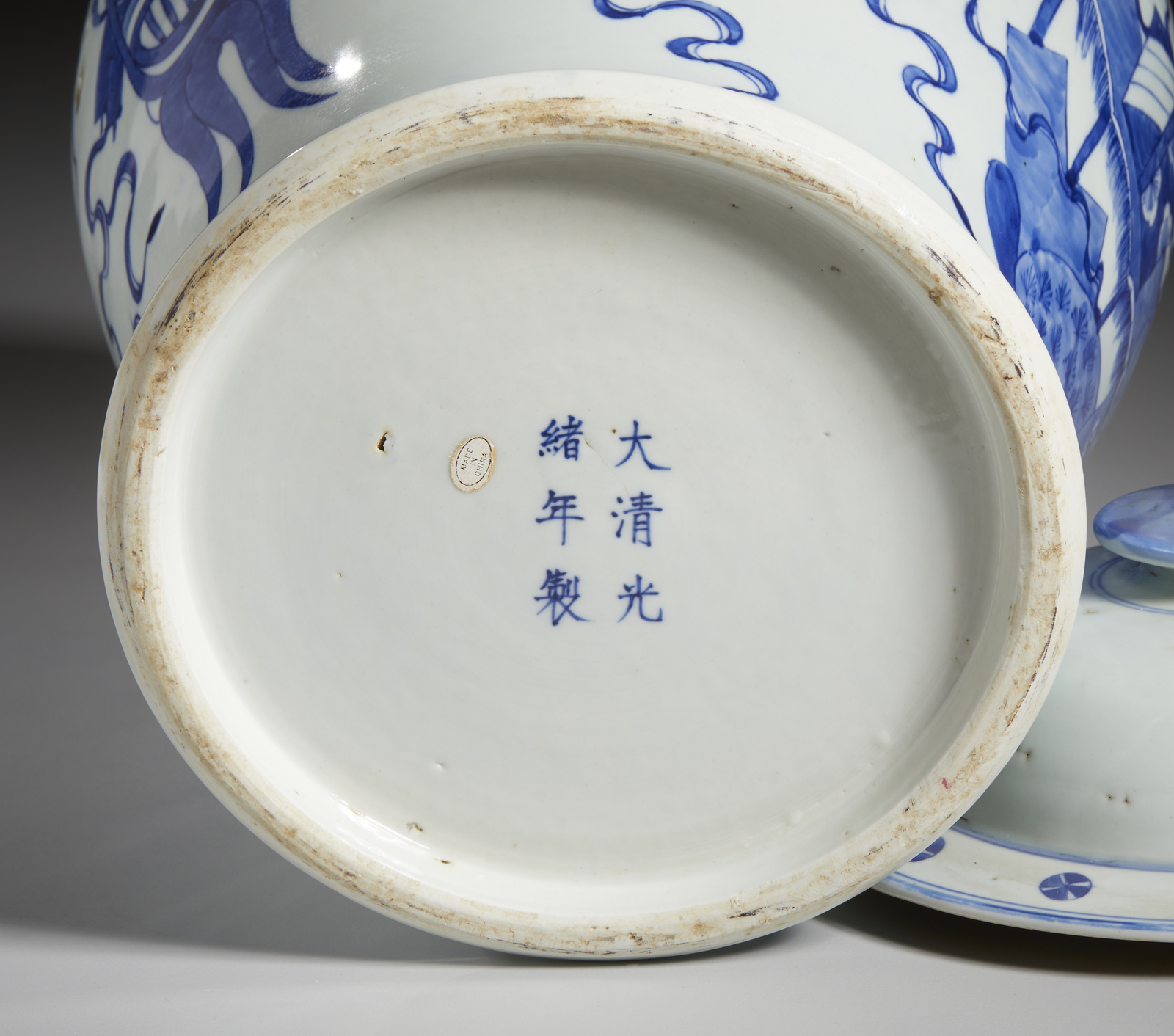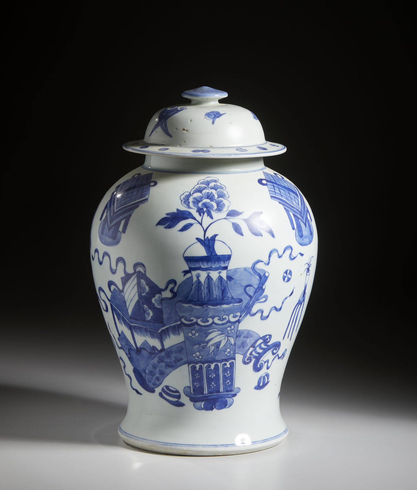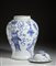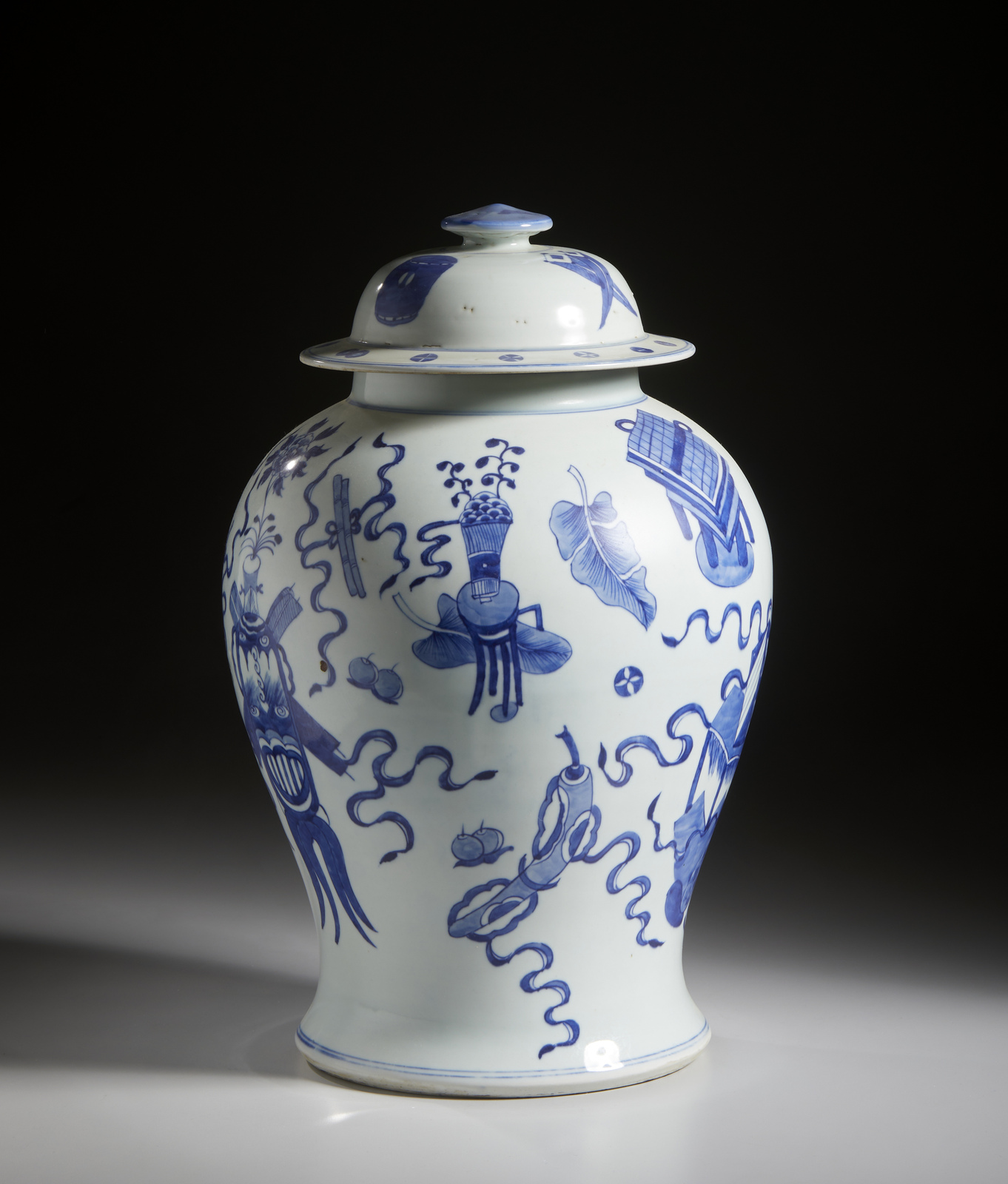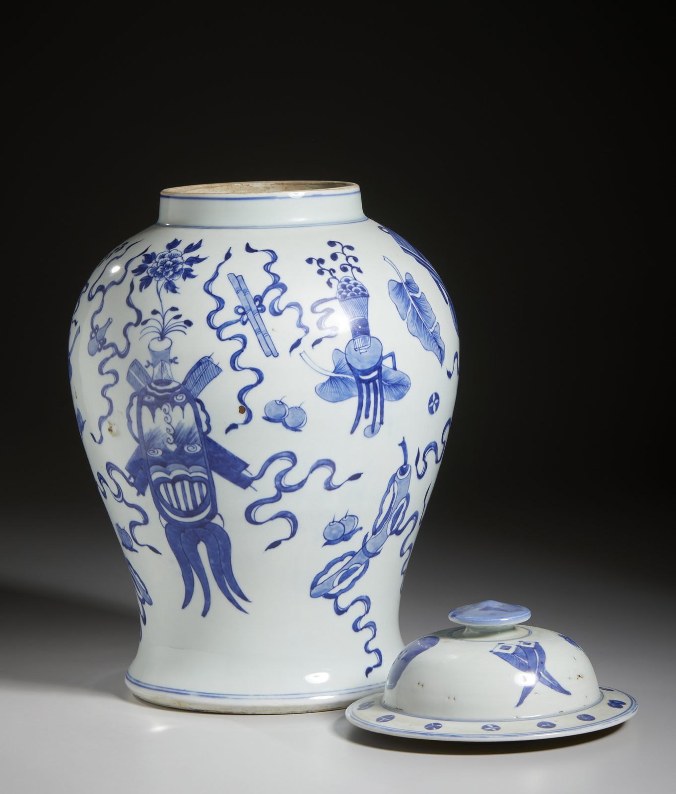 Cina, dinastia Qing, XIX secolo . . Cm 29,00 x 43,50. Giara in porcellana bianco blu a corpo pesante, dipinta con simboli di buon auspicio e recante marchio Guangxu a sei caratteri sulla base.