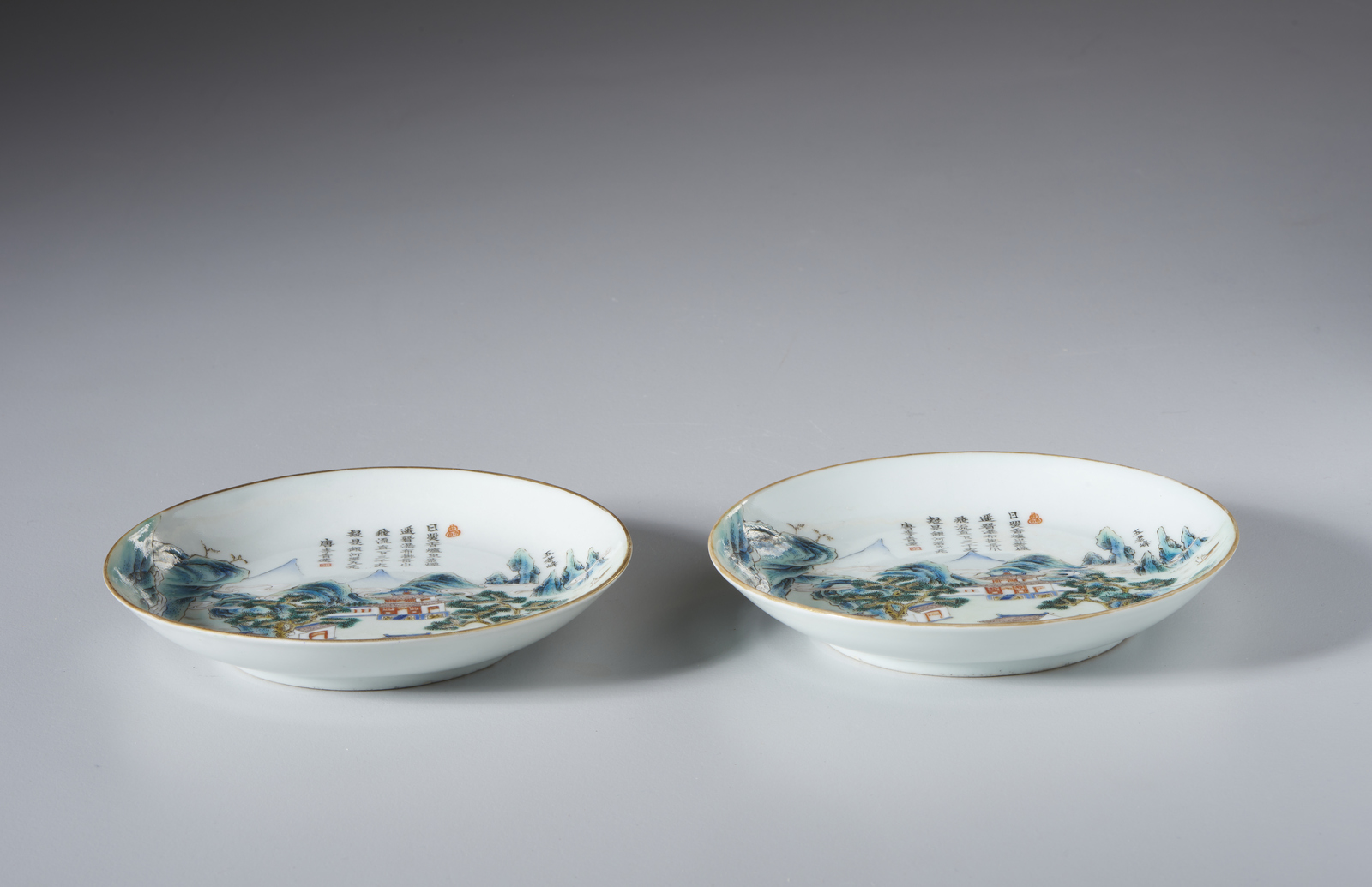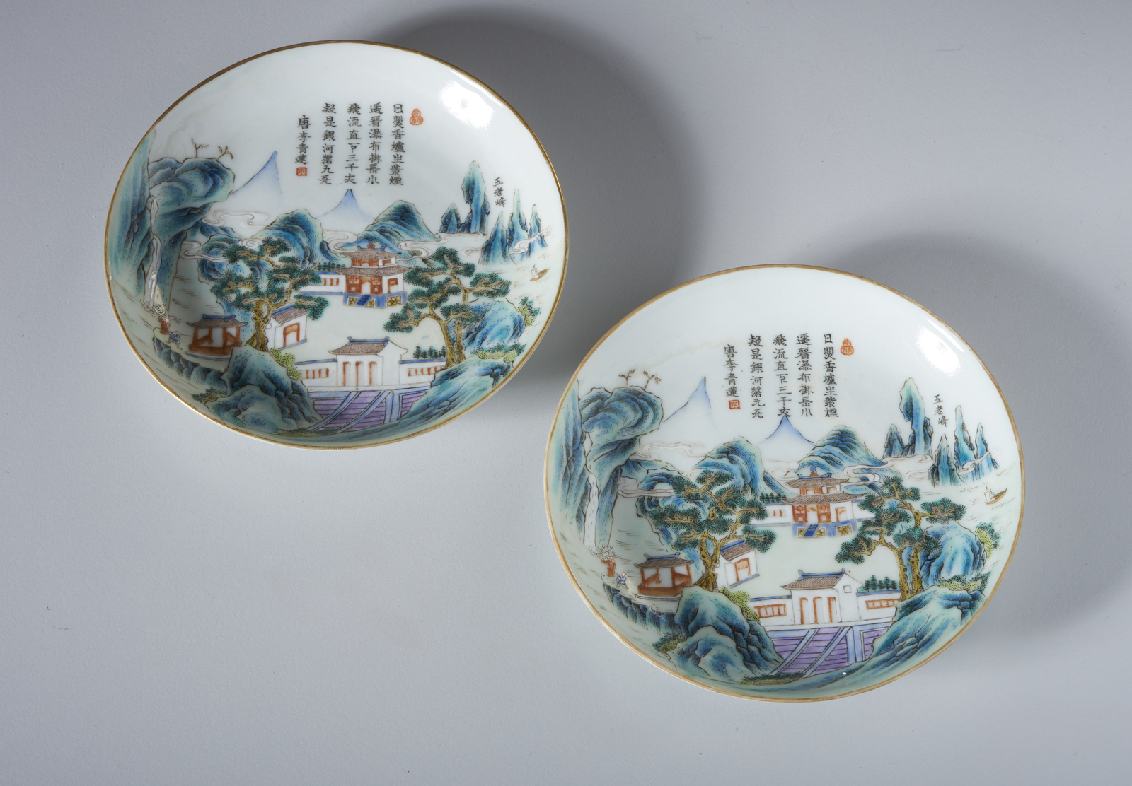 Arte Cinese - Coppia di piattini con paesaggio. Cina, Qing, XIX secolo .