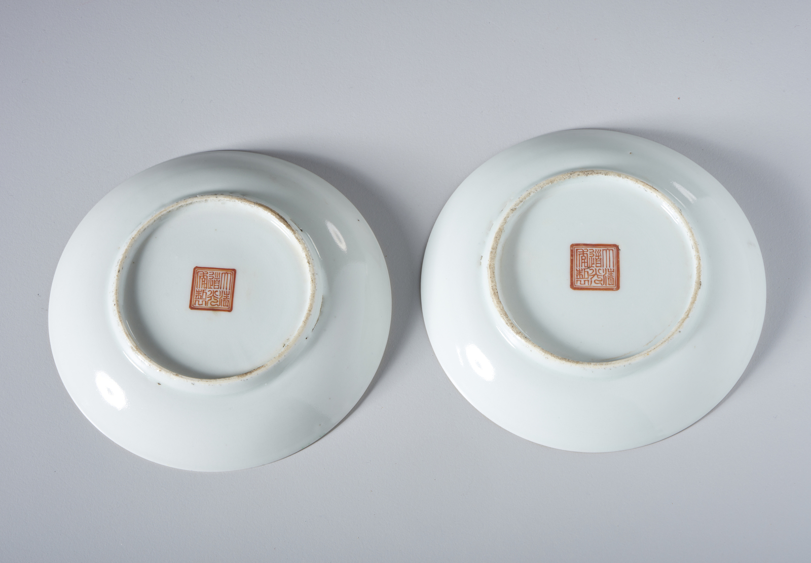 . . Cm 13,40 x 2,40. Coppia di piattini in porcellana decorati con paesaggio di montagna con pagode, presentano sul fondo marchio sigillare in rosso sopracoperta a sei caratteri di Daoguang.
