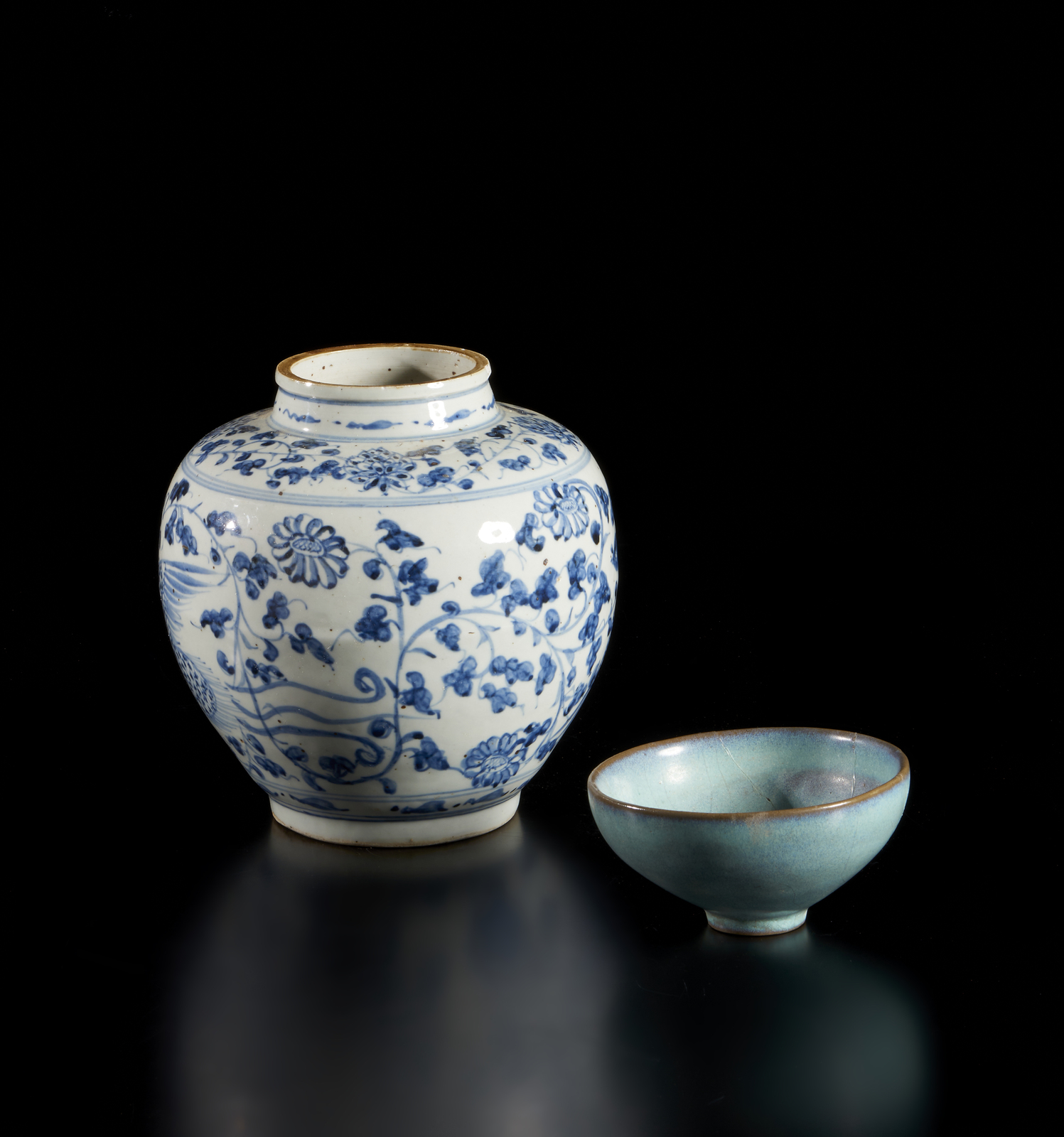 Arte Cinese - Una tazza Jun ed una giara bianco/blu Cina, Ming, XV secolo .